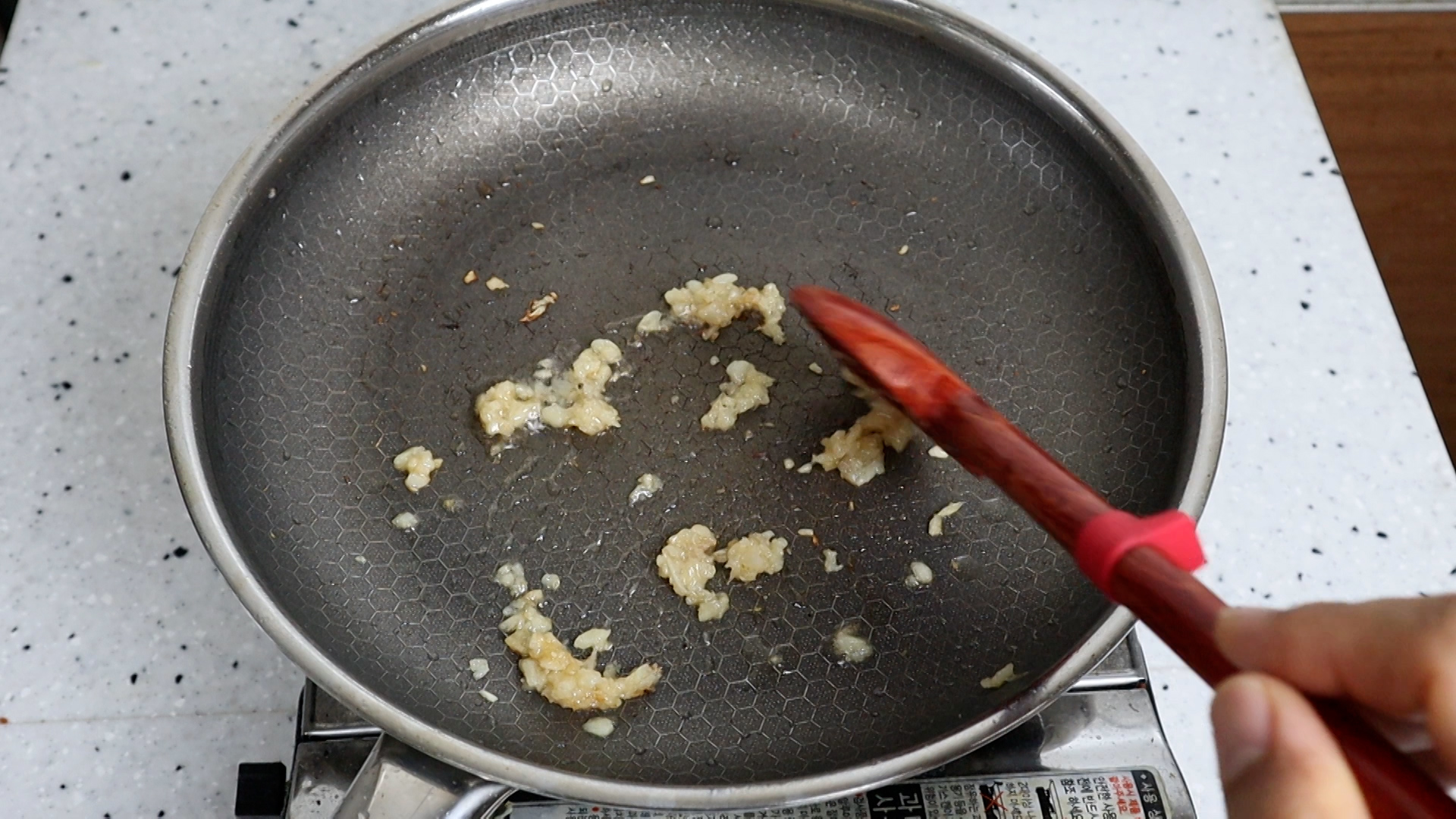 16. 약불에 간마늘 1스푼을 넣고 마늘이 노릇해지게 1~2분을 볶아주세요.