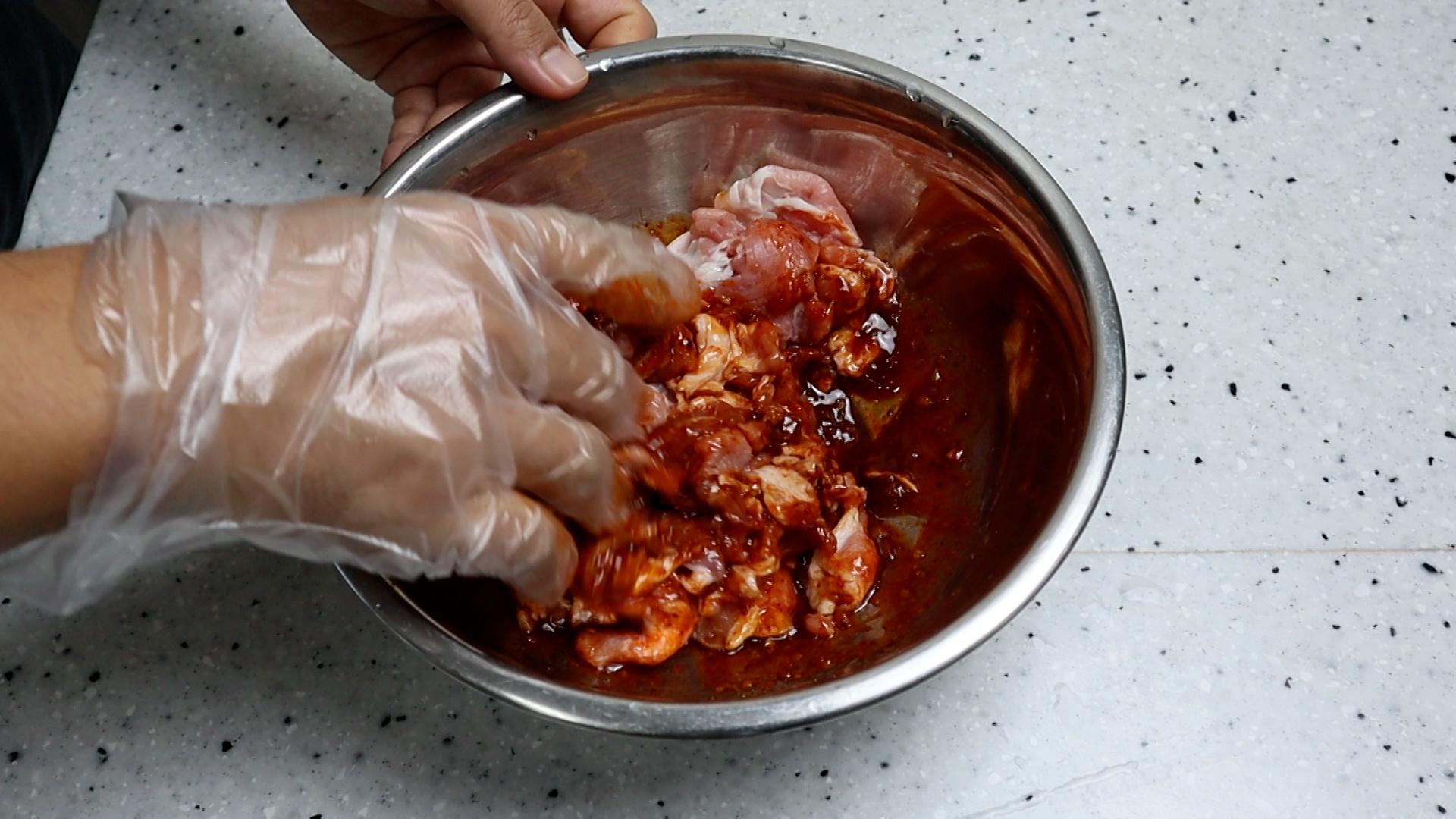 16. 섞어 놓은 양념에 2mm 정도로 얇게 썰려 나오는 제육용 돼지고기 앞다리살을 넣고 고기 사이사이 양념이 발리게 잘 치대서 바로 구워 먹어도 되지만 2시간 정도 냉장고에서 재워주시면 좀더 맛있을거에요!