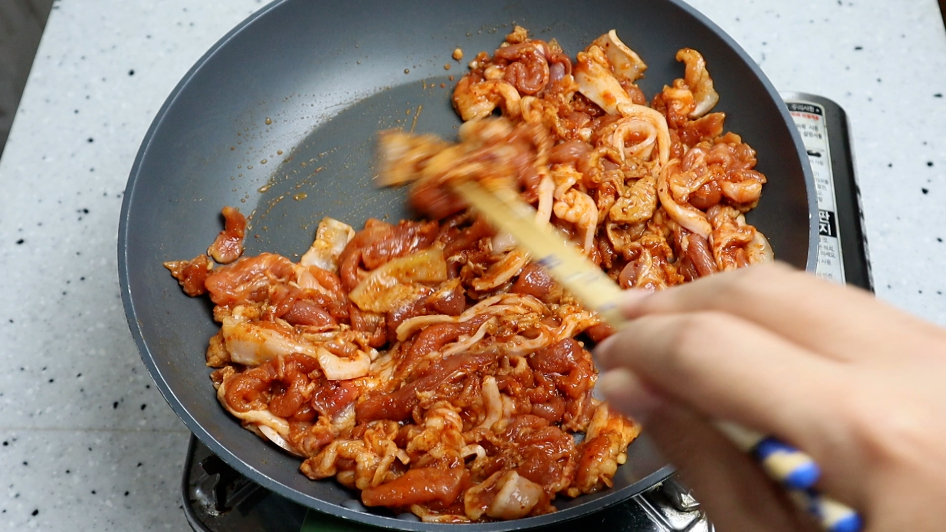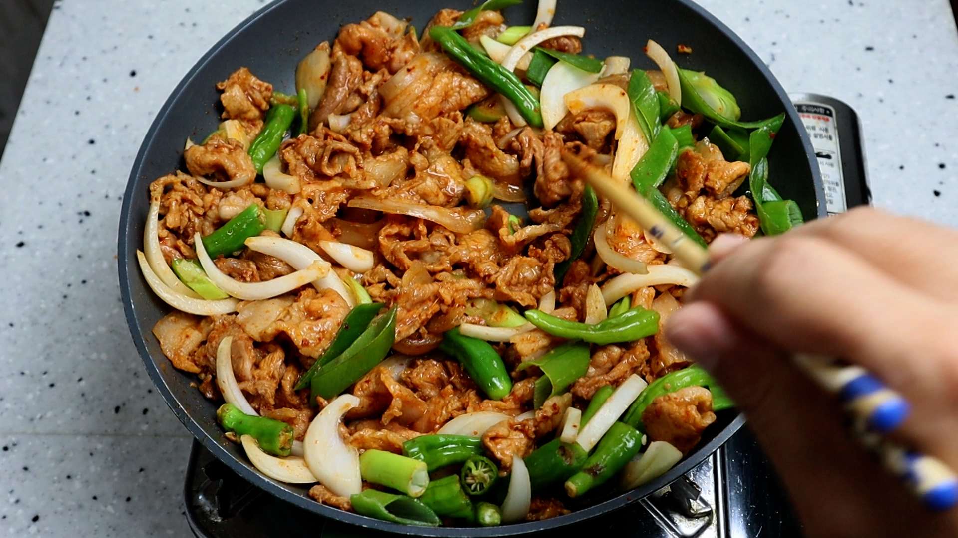 18. 2~3분 볶아서 고기 핏기가 거의 사라지고 80% 정도 익었을때 양파 대파 꽈리고추를 넣어주세요.