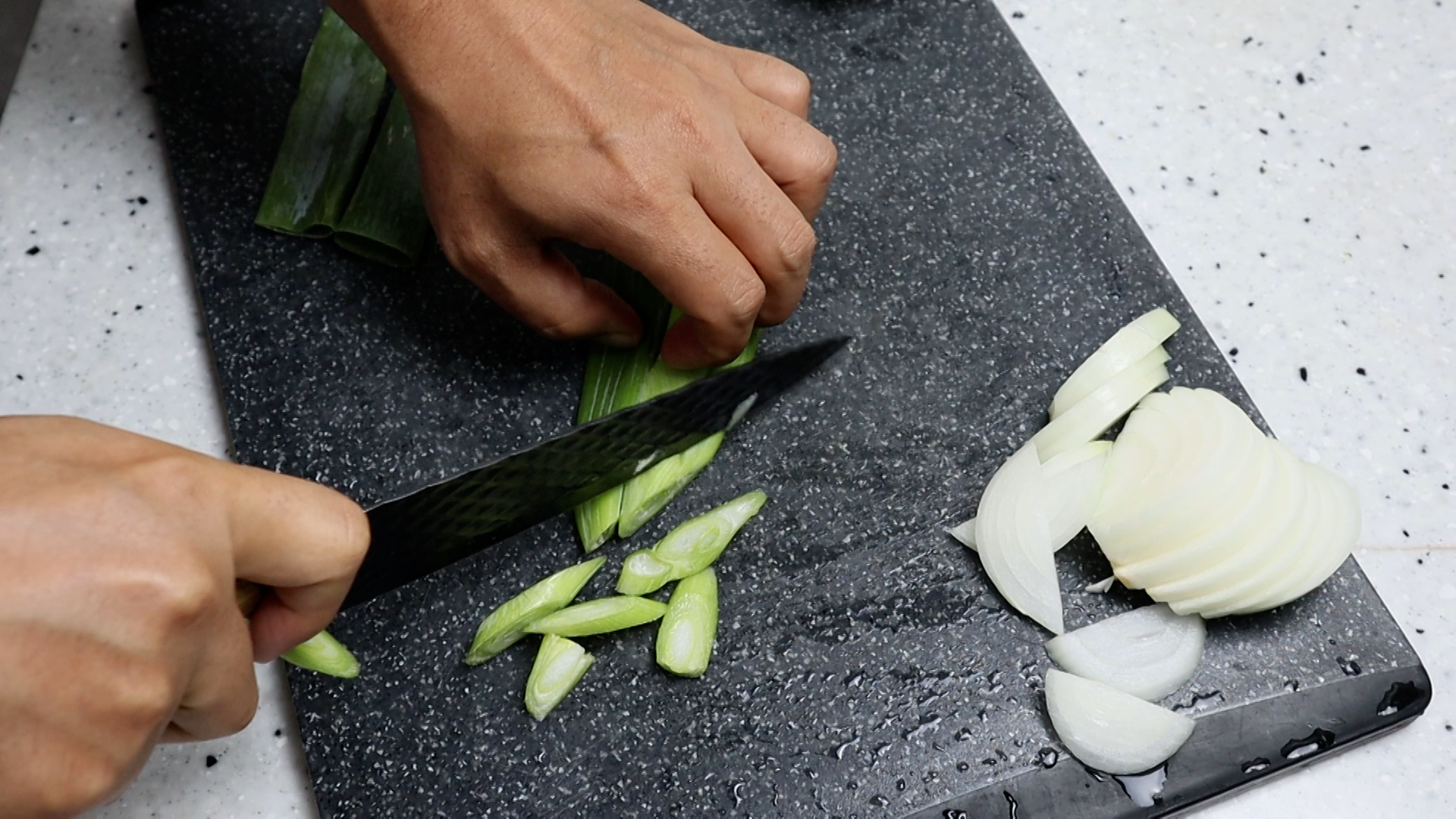 2. 대파는 초록대 흰대 적당히 섞어서 어슷어슷 썰어주세요.