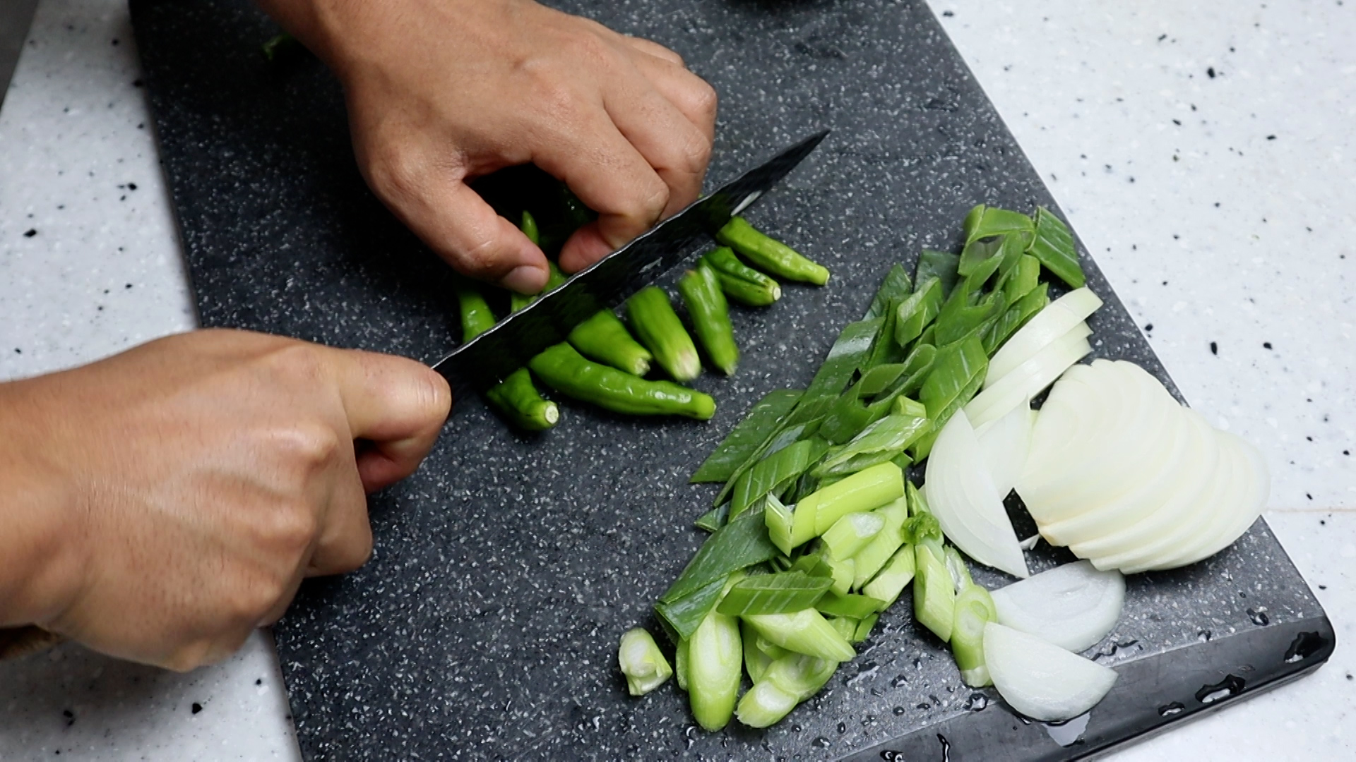 3. 깨끗히 씻은 꽈리고추는 먹기 좋은 크기로 3~4등분으로 잘라주세요.
