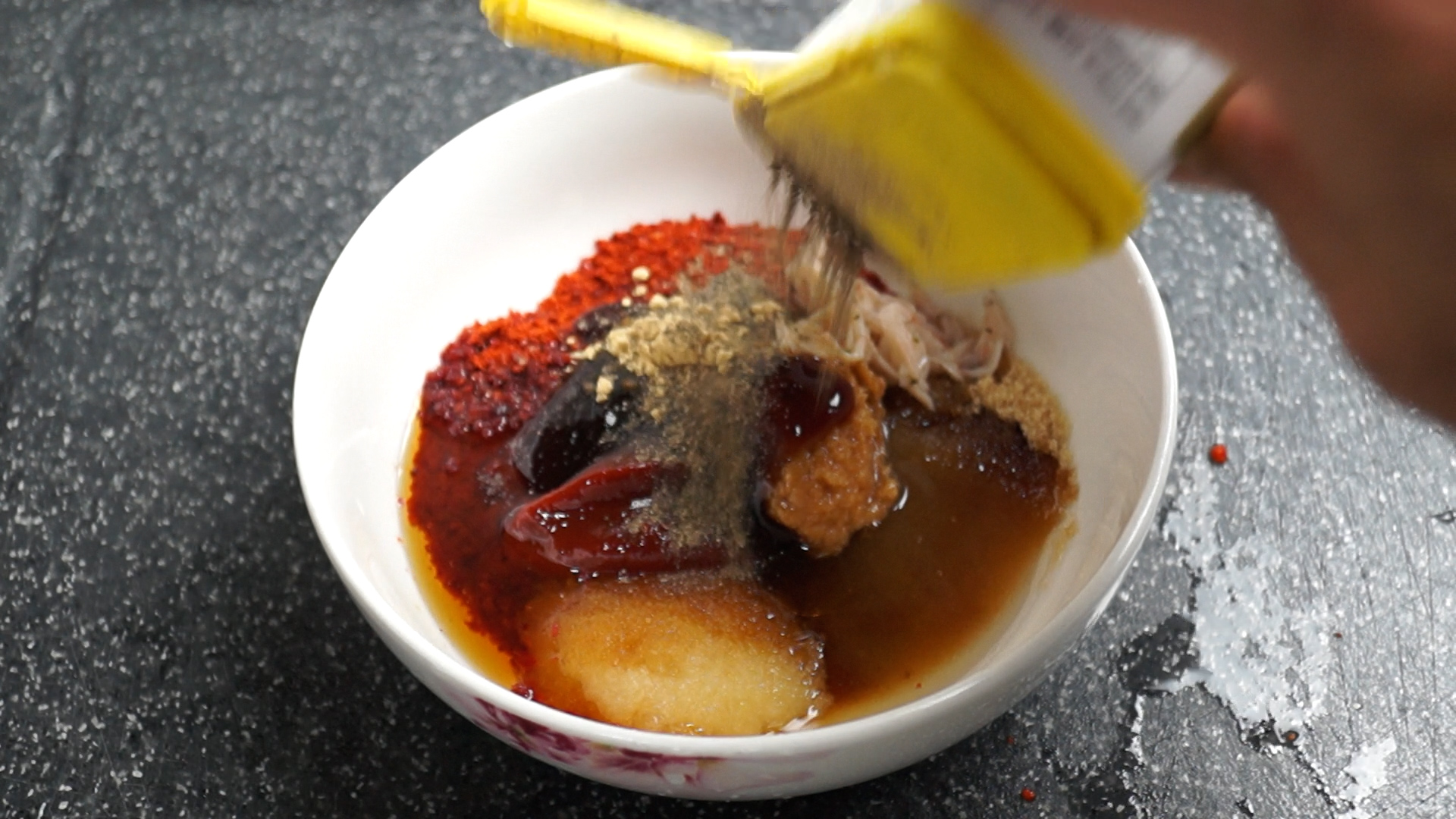 2. 양념란에 적힌 재료를 분량껏 전부 넣어주세요. 고춧가루는 중간입자 고춧가루를 사용해주세요.