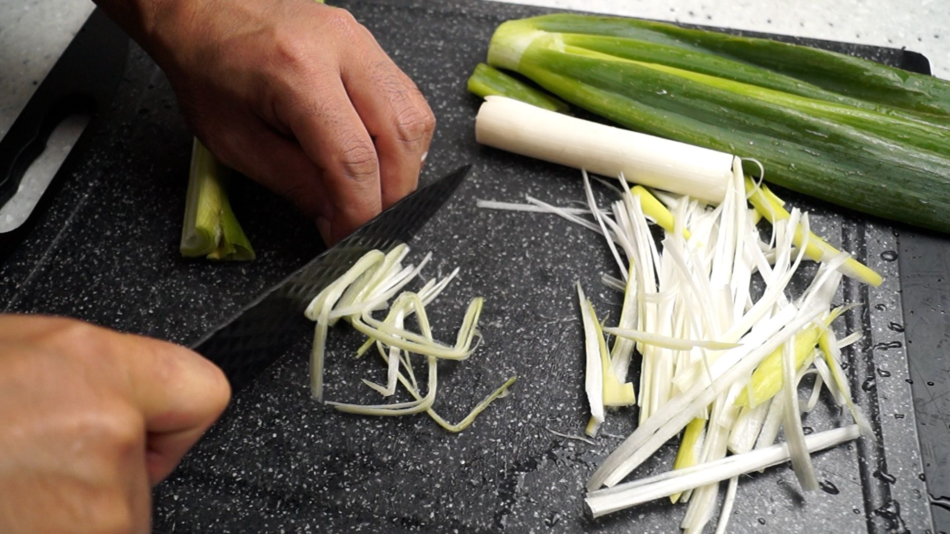 1. 대파를 큰거는 1대 또는 작은거는 2대를 길쭉하게 채를 썰어주세요. 대파 채써는게 어려우시면 대패삼겹살 사실때 파채용 대파를 사시는것도 좋습니다.