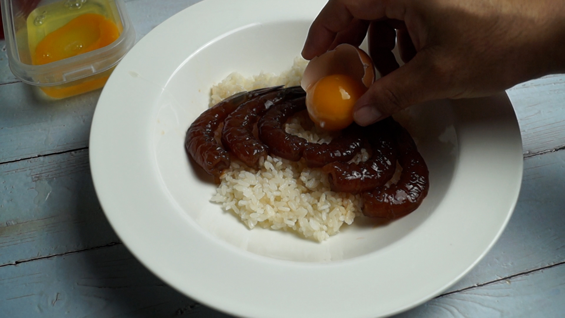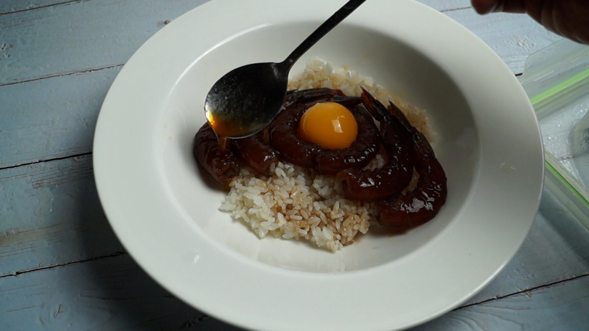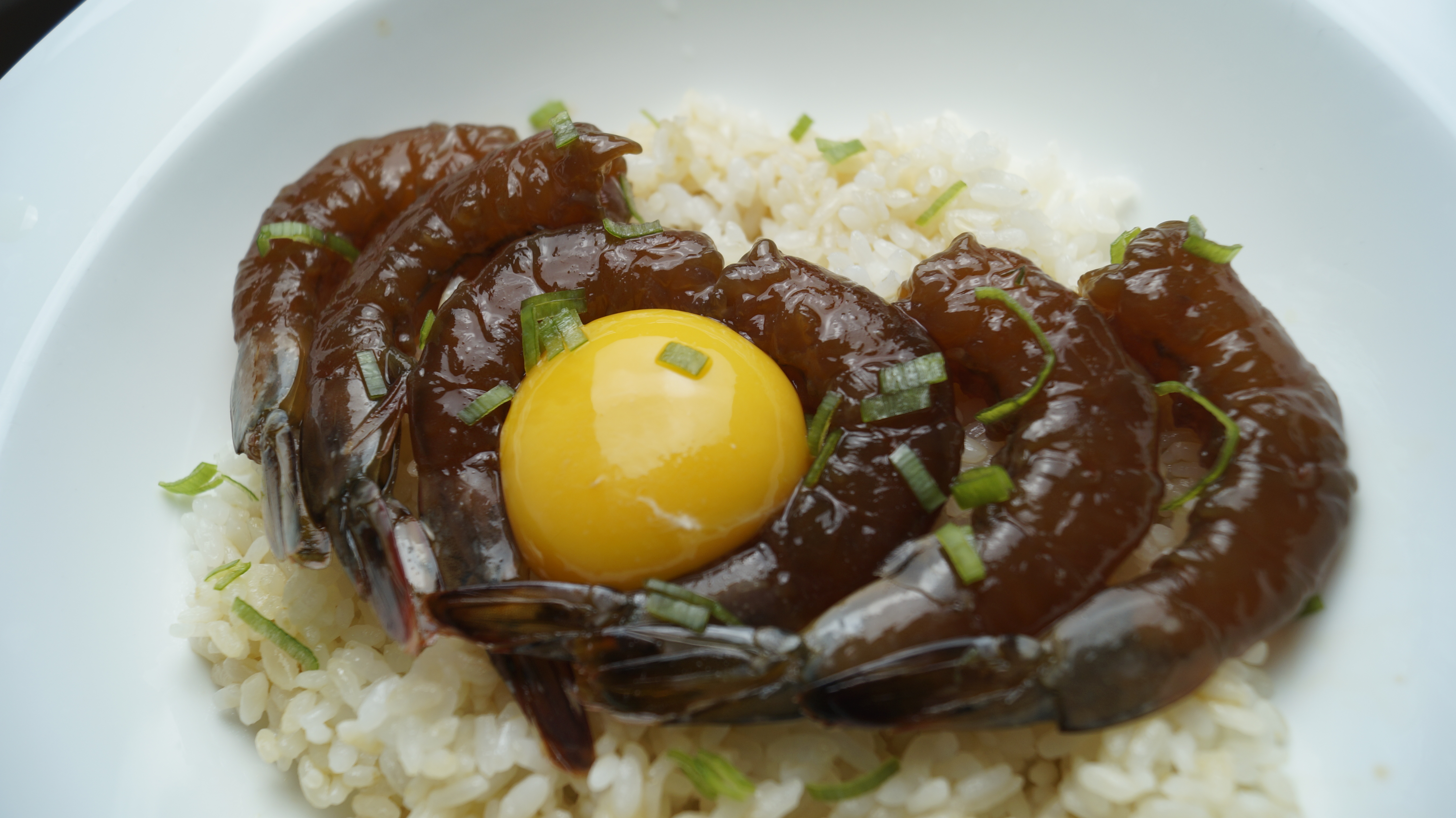 27. 밥 위에 새우 5~6마리 올리고 노른자 한개 올려준 다음!!