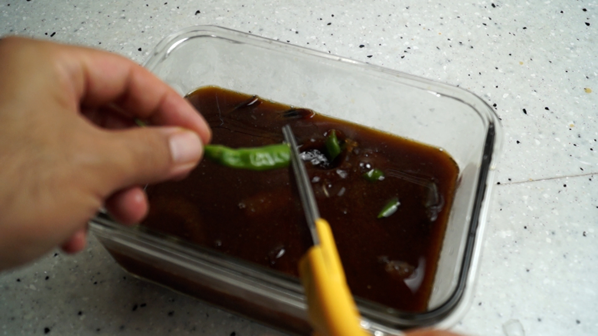 25. 새우에 다시 식혀 놓은 간장을 붓고 땡초 1개 또는 레몬 1~2조각을 썰어서 띄워주세요. 땡초나 레몬은 생략하셔도 됩니다.