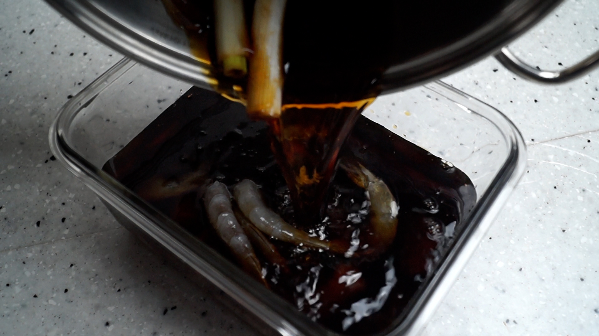 24. 끓어 오르면 바로 불을 끄고 찬물에 식혀주세요. 이 과정에서 간장으로 빠져나온 새우혈액과 불순물들이 뭉쳐서 떠오르고 새우에서 빠져나온 수분으로 떨어진 염도를 다시 올려 줄수 있습니다.