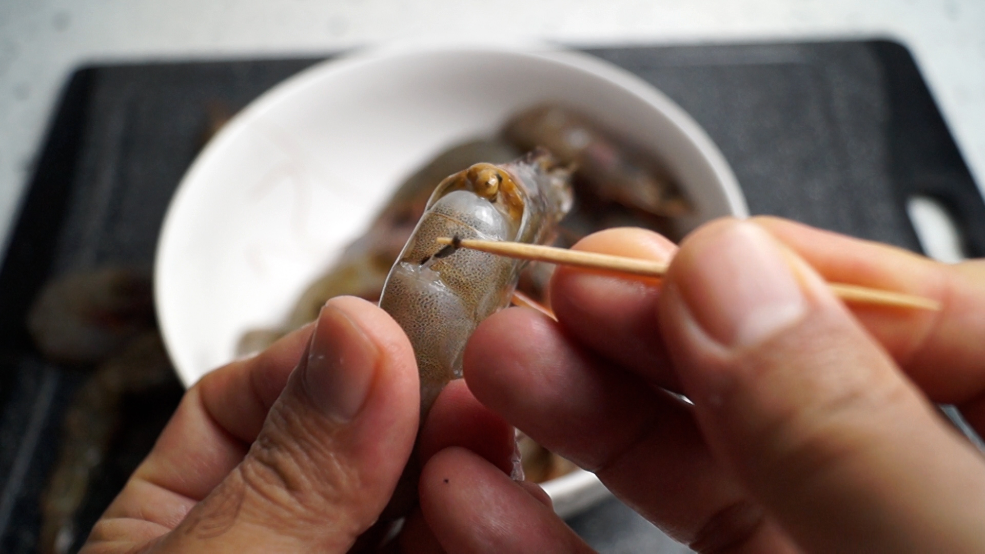8. 새우 머리와 등이 맞닿은 마디 바로 다음 마디에 이수시개를 집어 넣어서 들어 올리면 내장을 쉽게 뺄수 있습니다.