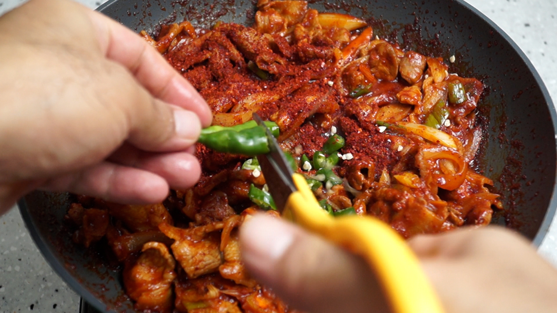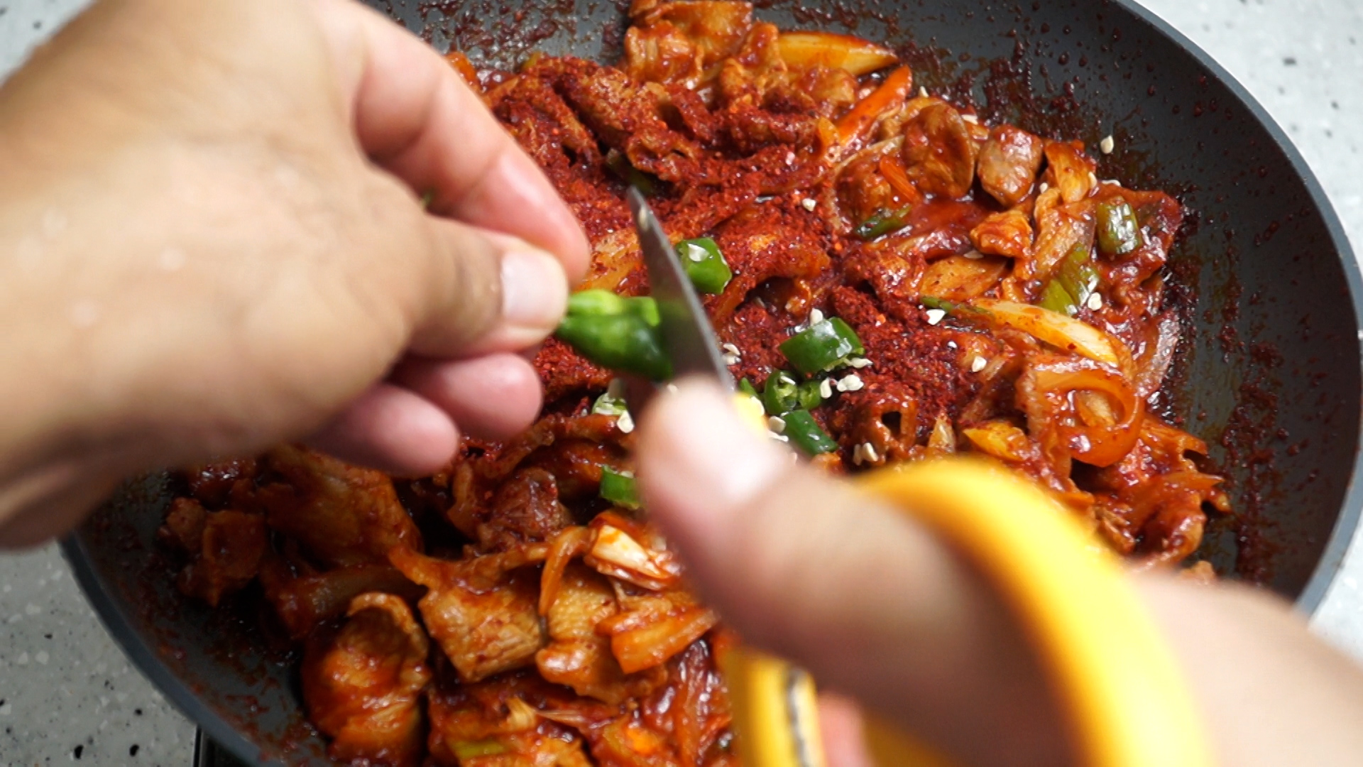 20. 2단계 매콤한 제육은 야채넣고 1분만 볶은 다음에 고춧가루 1스푼과 땡초 매운걸로 2개를 넣고 1분을 더 볶아주세요.