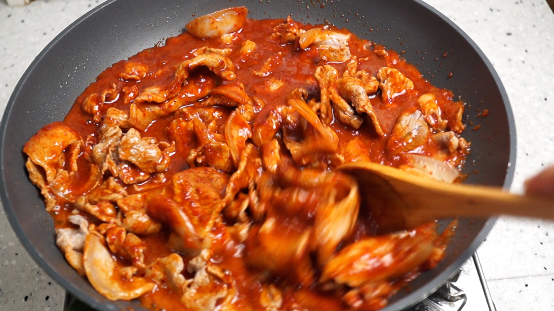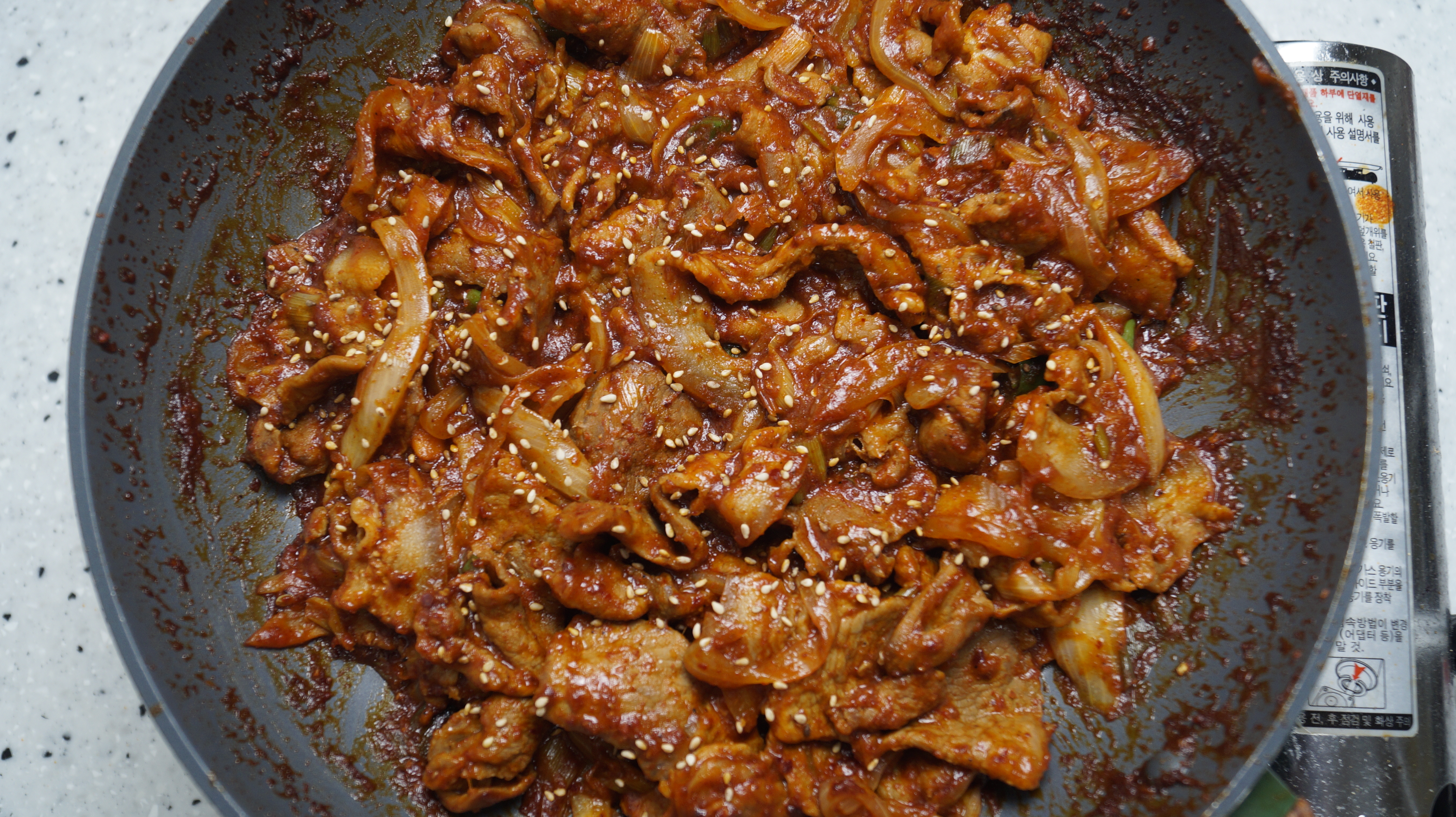 18. 고기가 80~90% 익은 시점에서 양념을 전부 넣고 1분 간 강불에 볶아주세요.