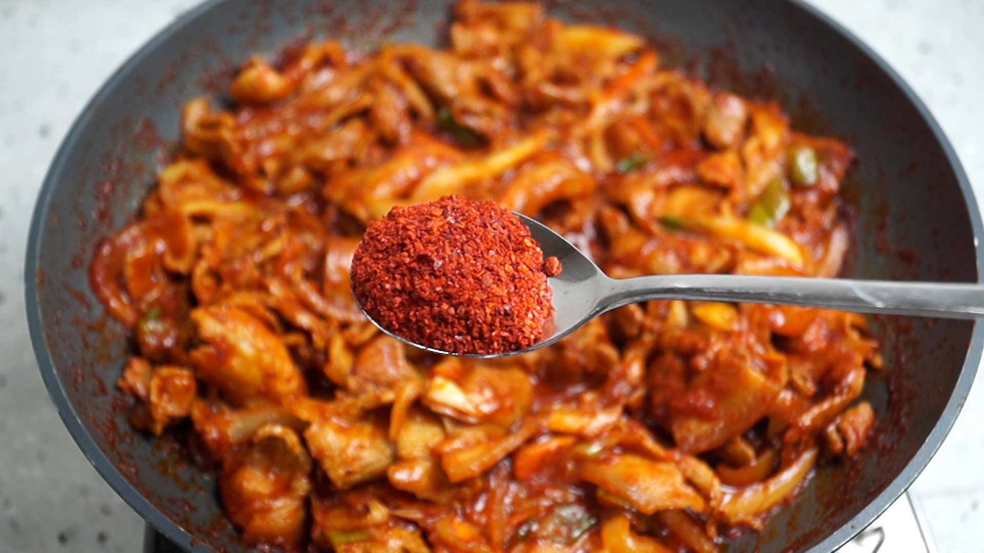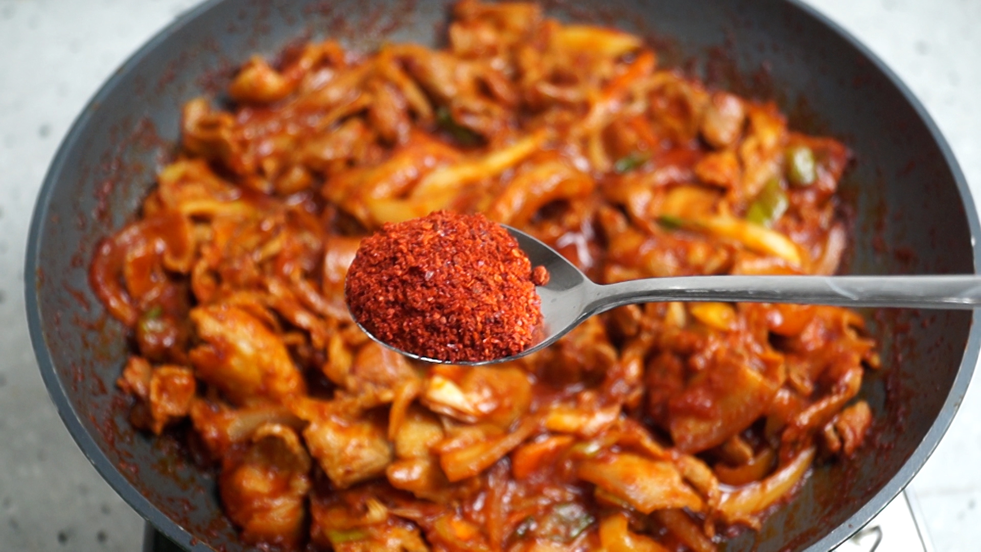 21. 3단계 매운맛은 야채넣고 1분을 볶은 다음 매운 땡초가루 2/3스푼을 넣고 땡초 2~3개를 잘라넣고 1분을 더 볶아주세요.