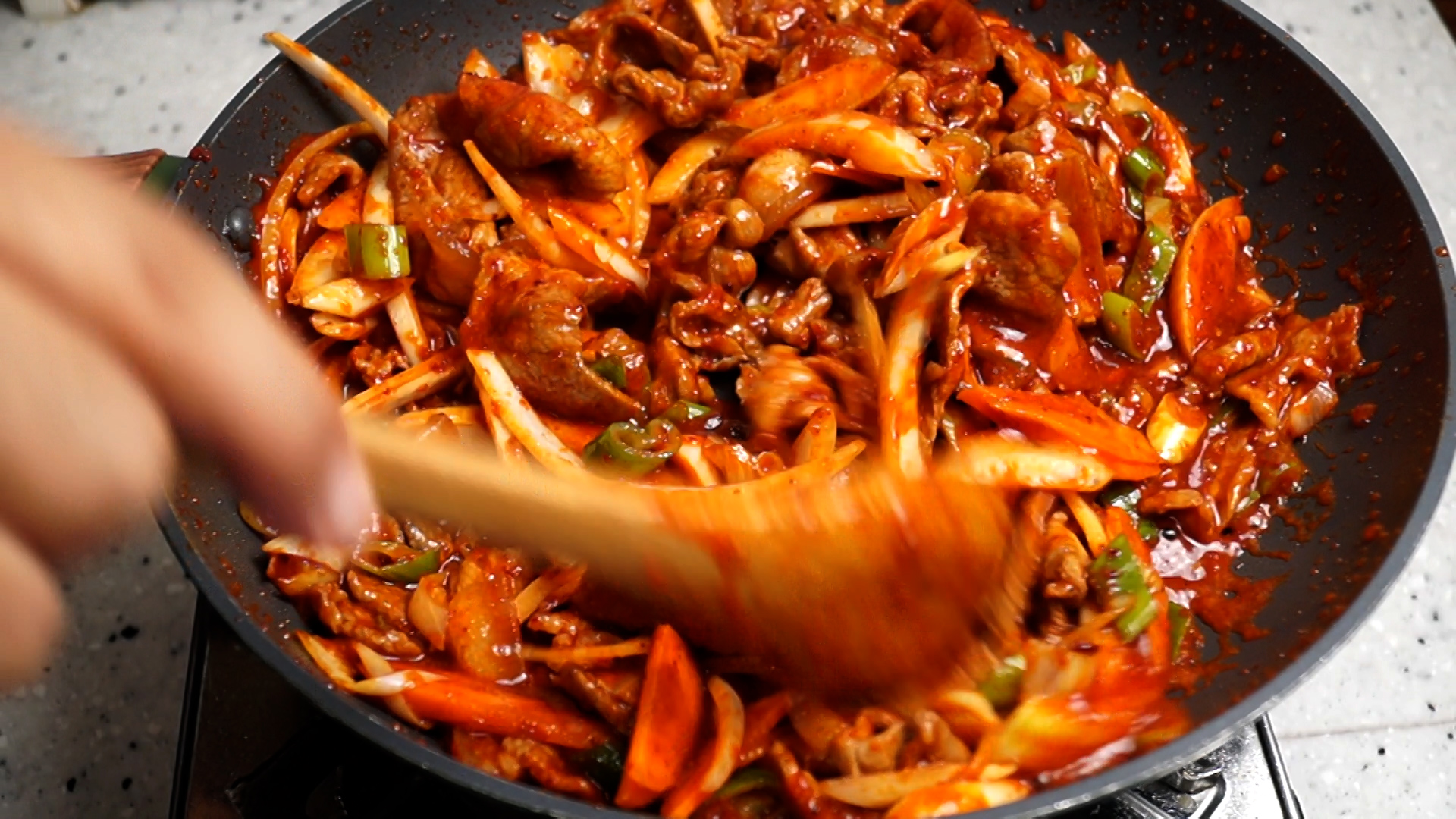 19. 야채를 넣고 강불에 2분 정도 볶아주시면 일반 맛!! 제육볶음이 됩니다.