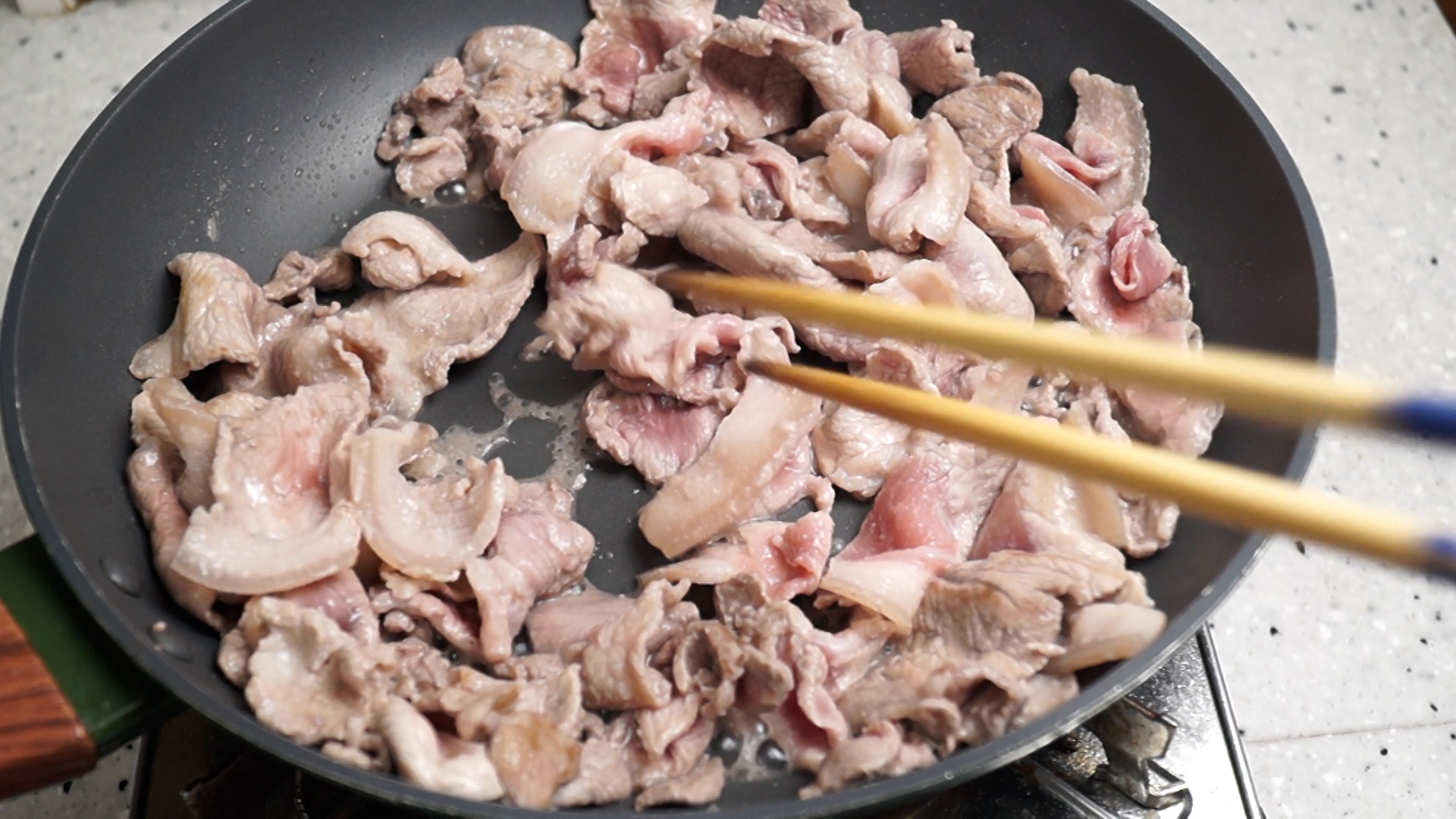 17. 강불로 달군 팬에 제육용앞다리살 얇게 썰려 나온걸 넣고 볶아주세요. 생고기는 뭉쳐 있는 경우가 많으니 겹친 고기를 뜯어 주면서 구워주시면 좋아요.