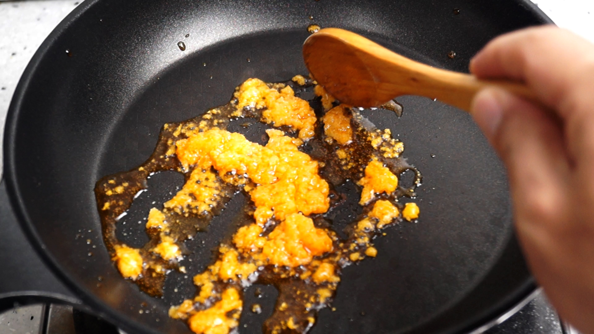 23. 팬에 다진마늘 1스푼과 식용유 고추기름을 붓고 약불에 2분 정도를 볶아주세요.고추기름이 없으시면 식용유를 1스푼 추가하고 고춧가루를 반스푼 넣고 볶아주세요.