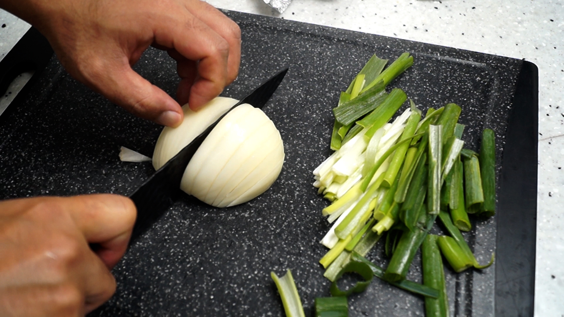 23. 양파 대파를 넣고 강불에 1분 정도를 볶아주세요.