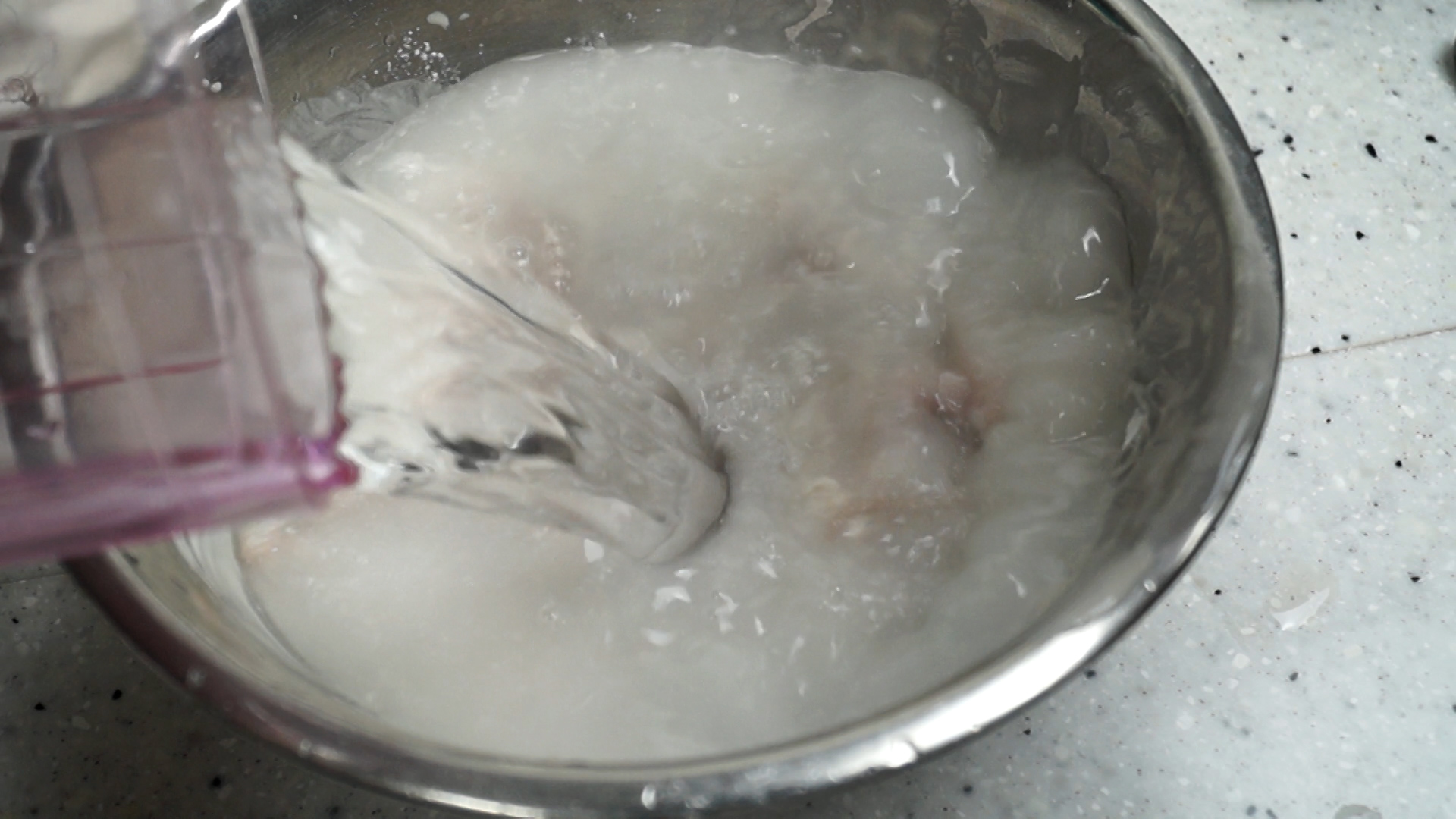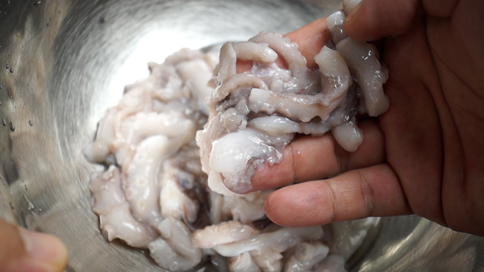 5. 낙지에 물을 넉넉하게 부어 2~3차례 씻어 밀가루를 완전히 제거해주세요.