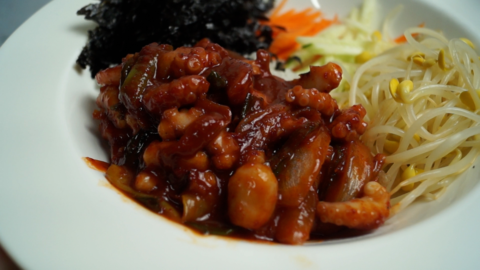 28. 밥 1공기에 당근,오이, 삶은 콩나물을 얹고 김가루를 뿌려주고 낙지볶음을 올려주세요.