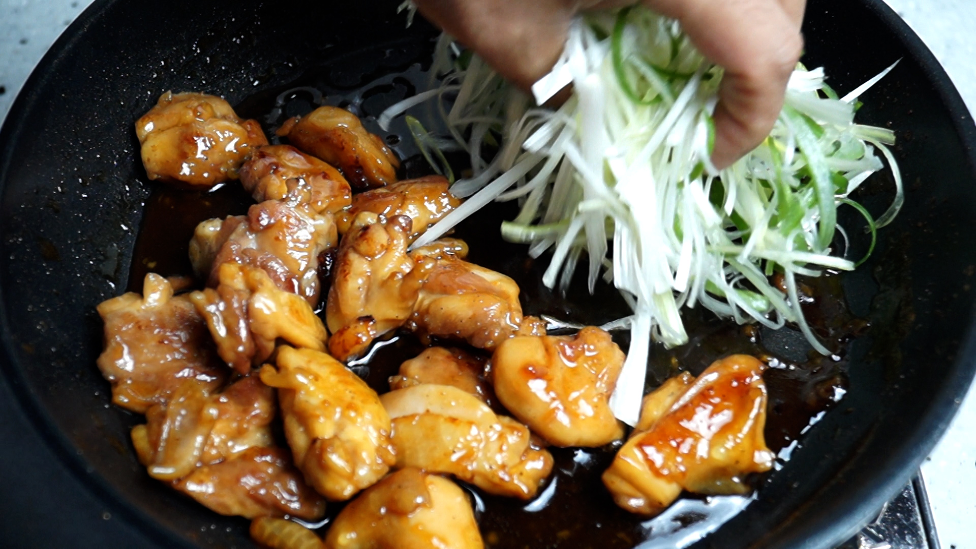 15. 팬에 식용유를 부은 다음 중불로 달궈서 닭 껍질이 아래로 오개 2~3분을 구워주고 뒤집어 주세요. 미림 성분 때문에 강불에 하면 겉이 빨리 탈수 있으니 꼭 중불에 천천히 구워주세요.