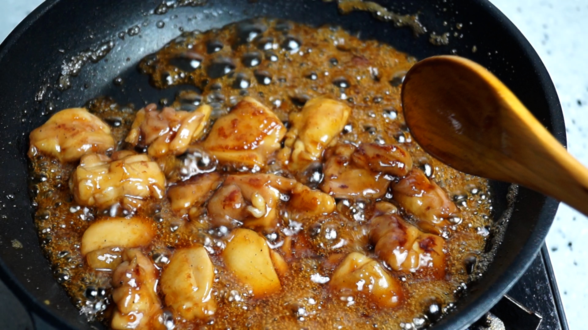 17. 양념이 자글거리기 시작하면 중불 유지하고 1~2분을 더 졸여주세요.