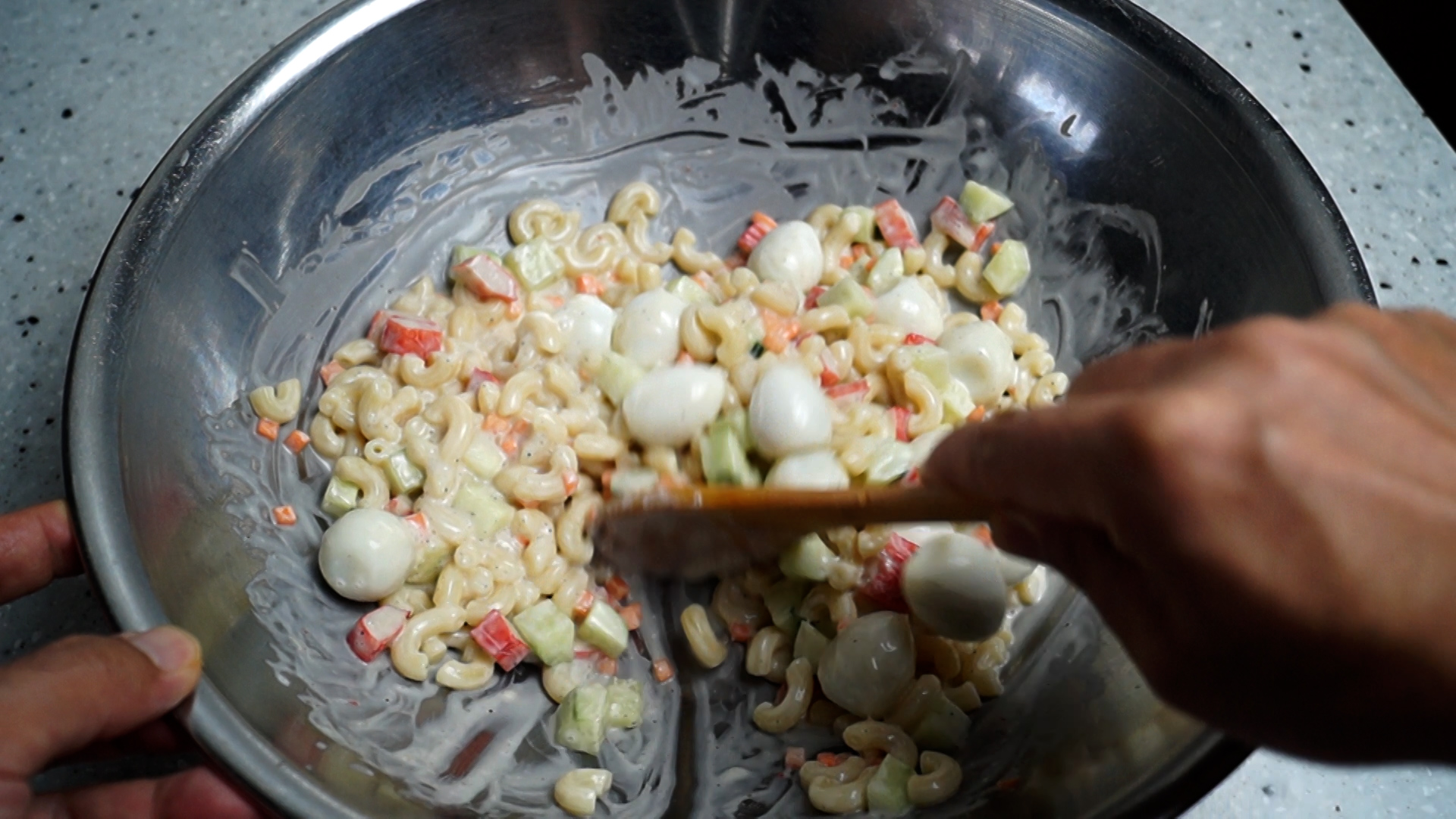 15. 물기뺀 마카로니와 다른 재료 전부 넣고 골고루 섞어주세요.