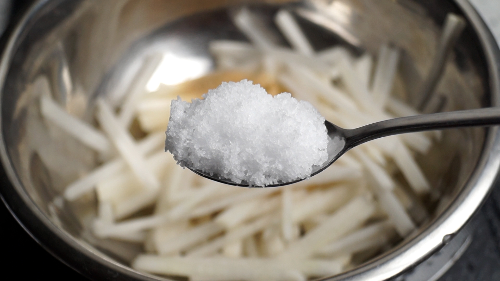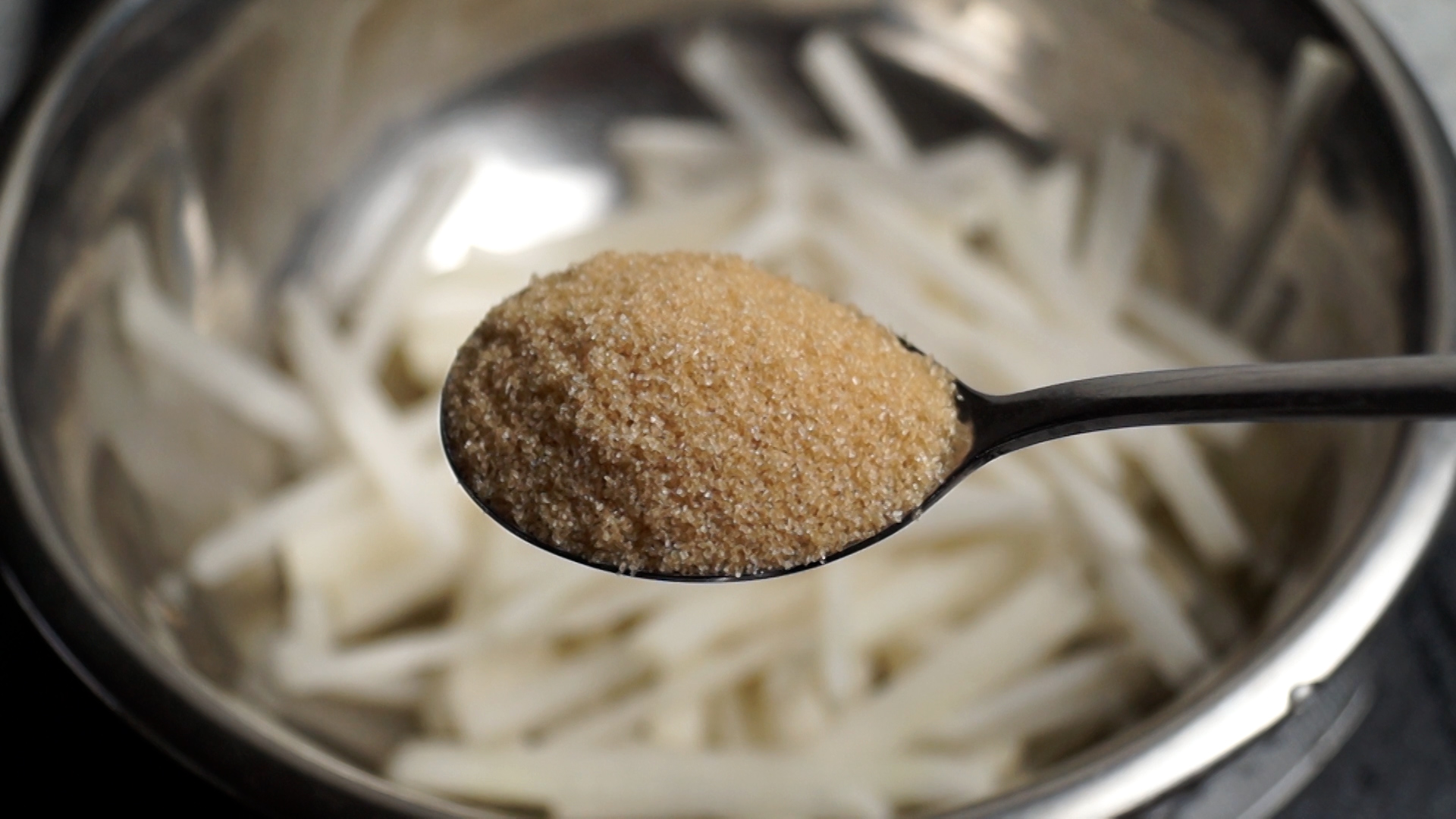 5. 무우를 볼에 담고 설탕을 깍아서 2스푼 넣어주세요.