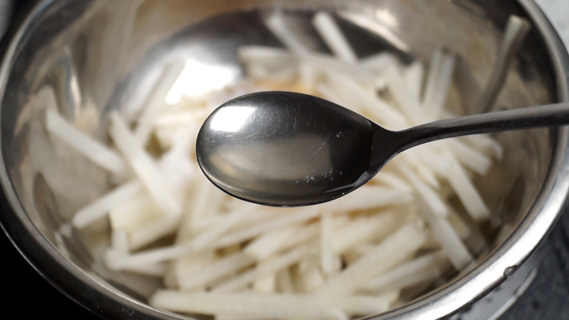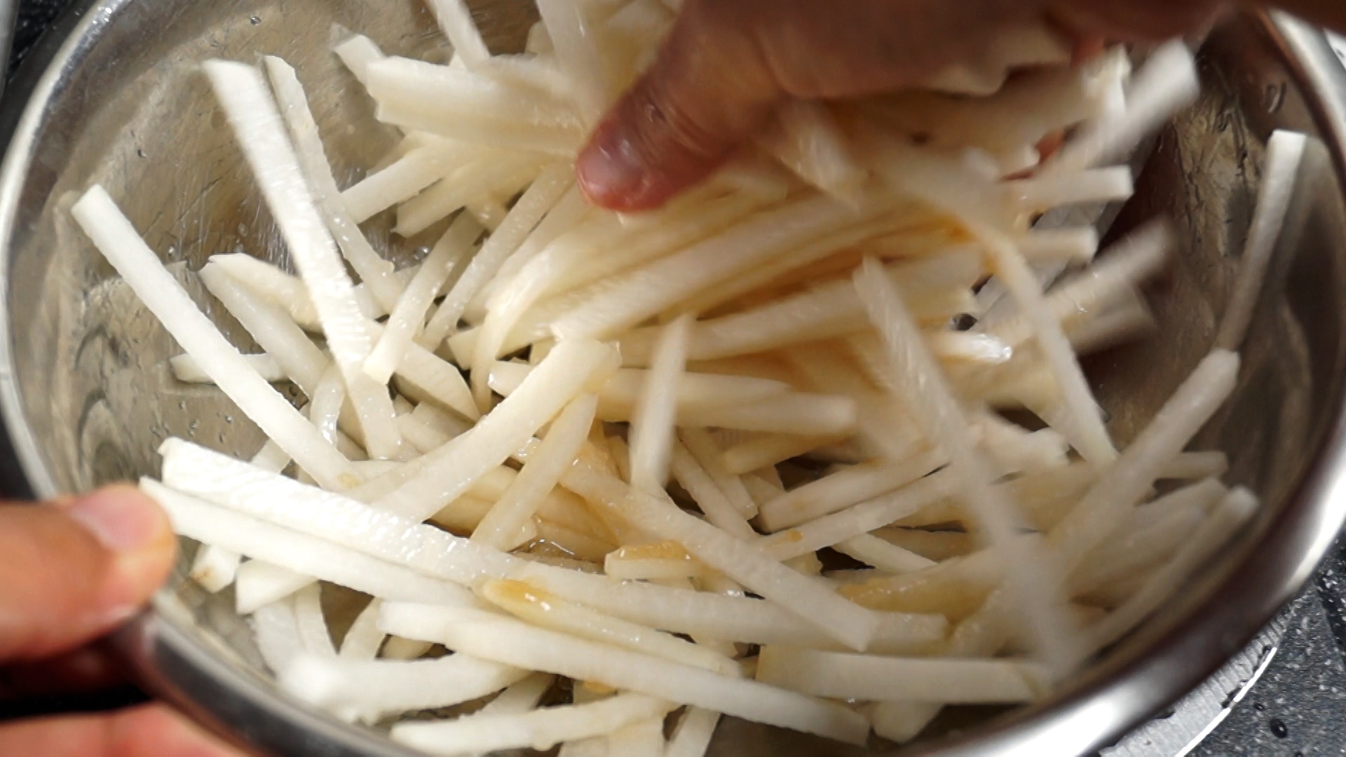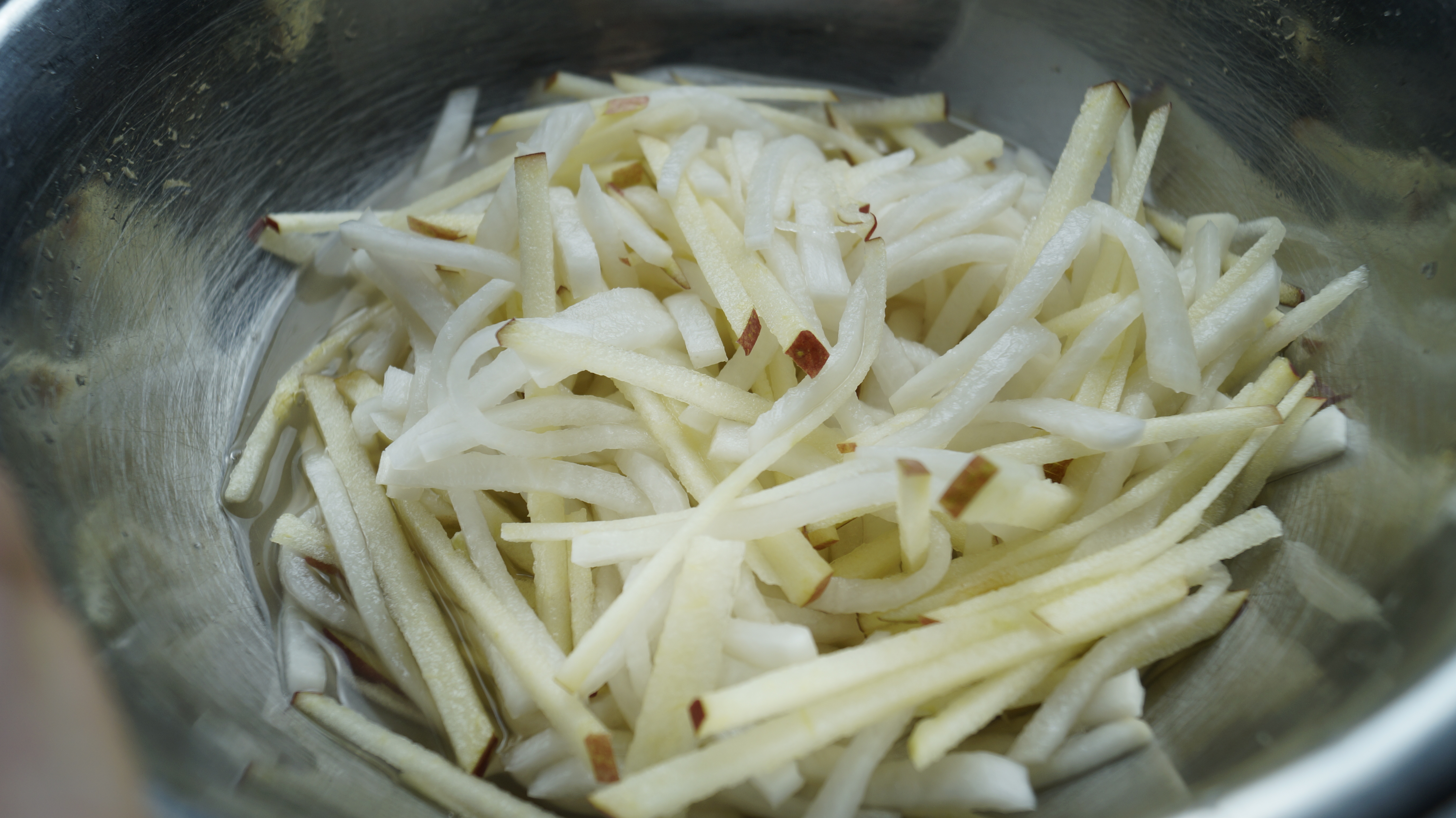 4. 무우는 대략 0.5cm 정도 두께가 나오게 채를 썰어주세요.