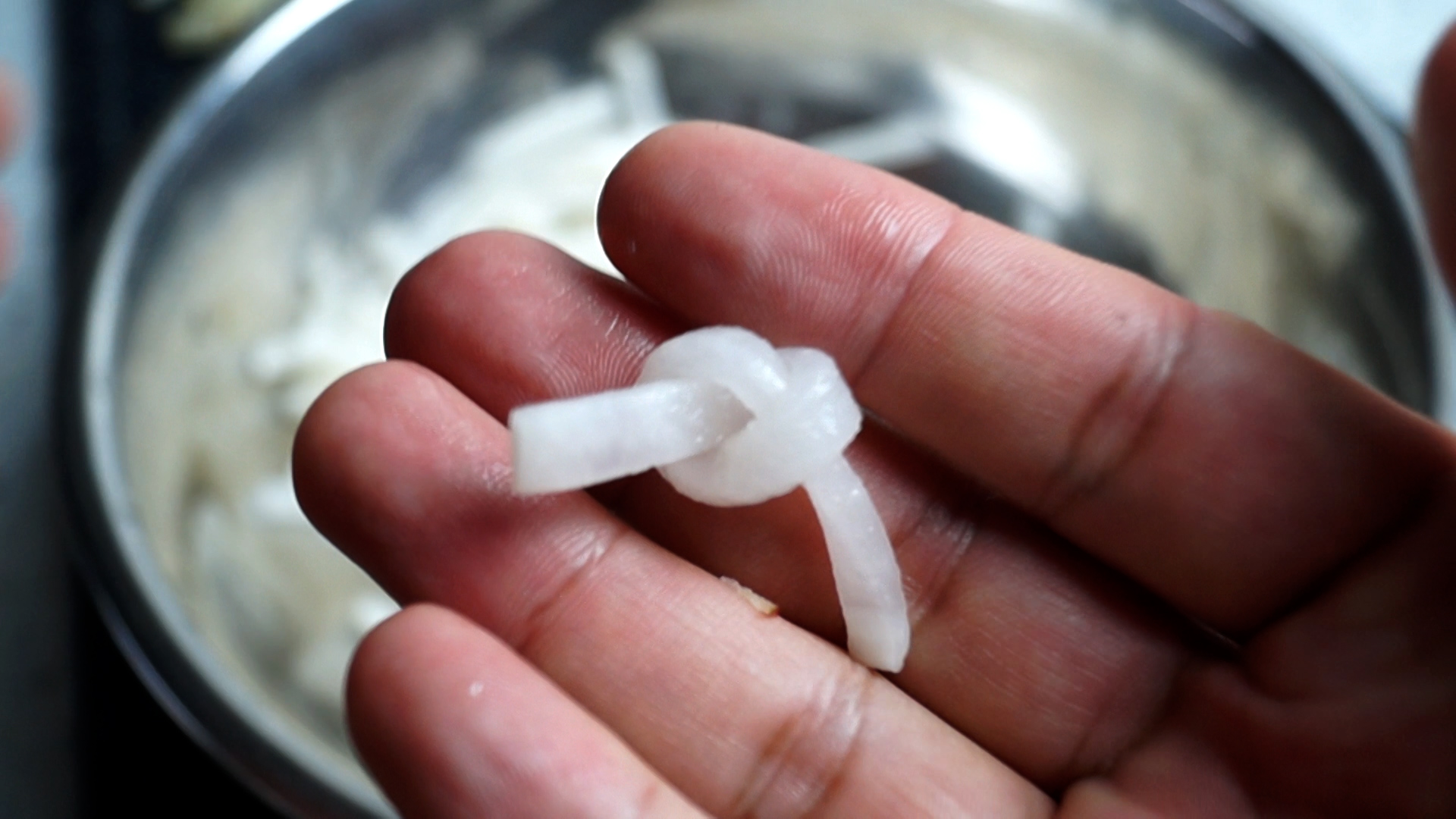 8. 절인 무우가 잘 휘어지고 매듭이 만들어질 정도로 부드럽게 휘면 잘 절여진겁니다.
