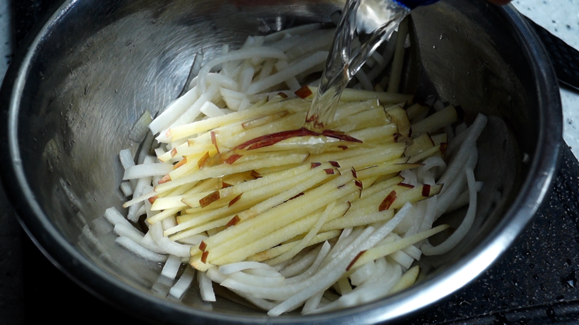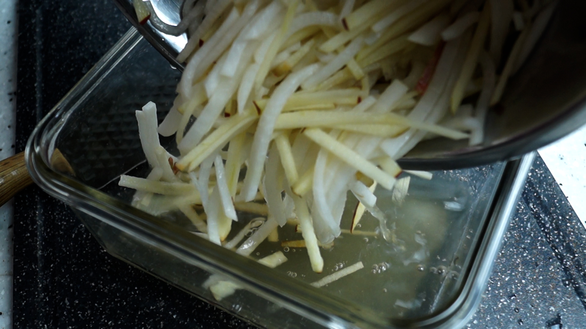 10. 절인 무우에 썰어둔 사과를 넣고 정수물 100cc 를 부어주세요.