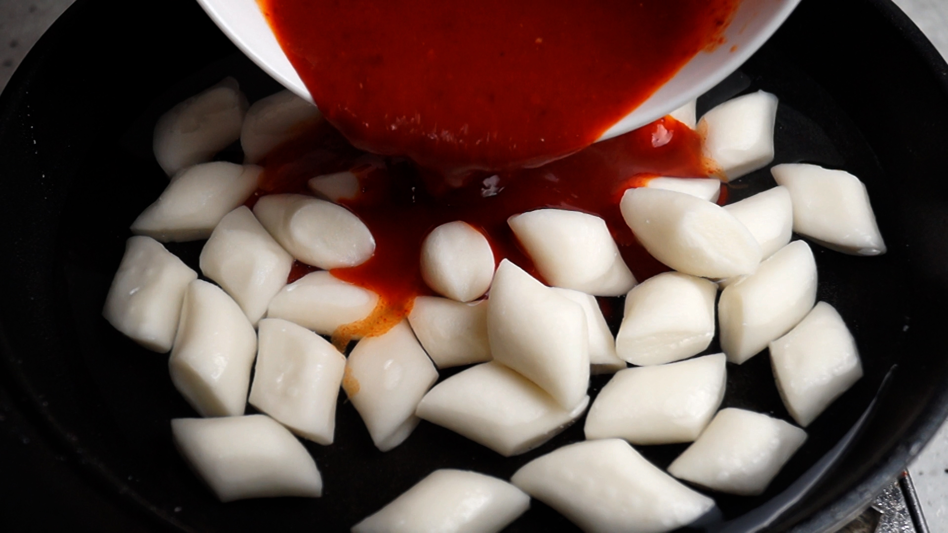 12. 팬에 물 또는 멸치육수를 붓고 떡을 넣은 다음 양념장을 전부 부어주세요.