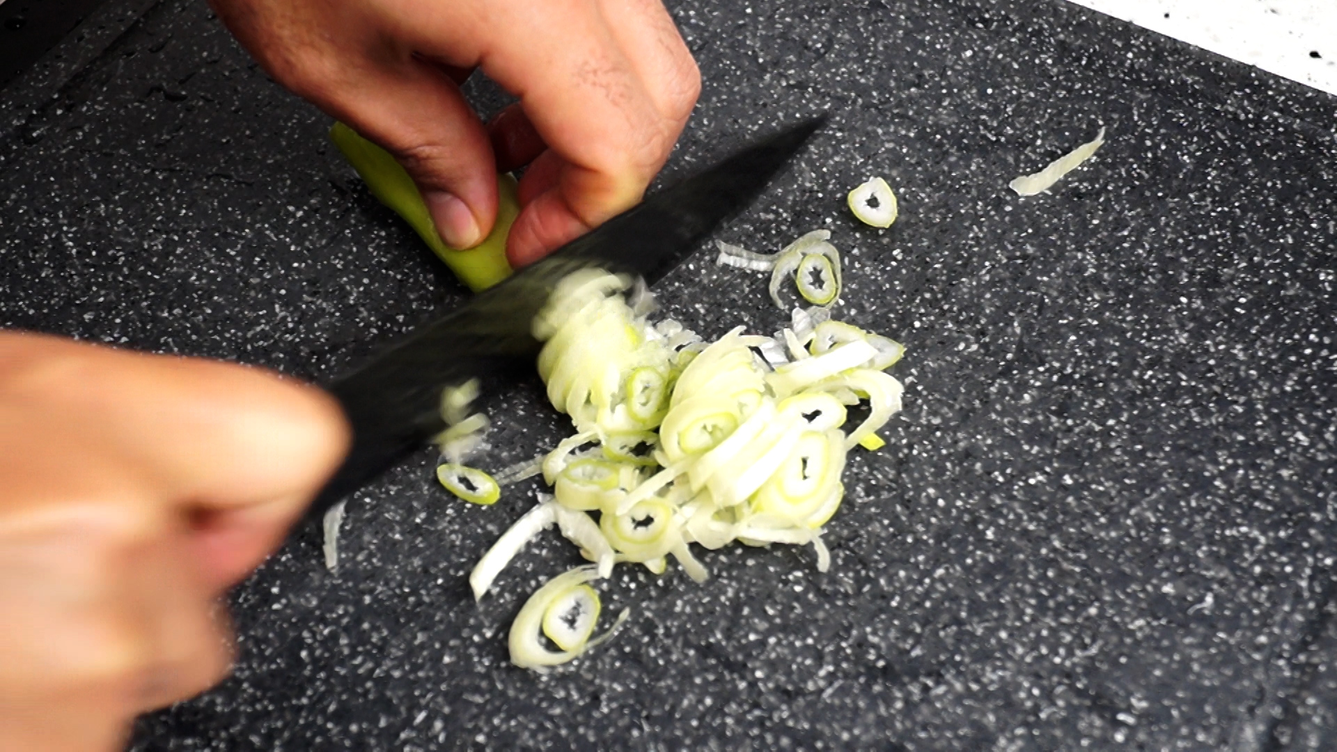 13. 대파를 넣어주세요. 여기에 당근 30~40g 얇게 썰어 넣으셔도 좋아요~