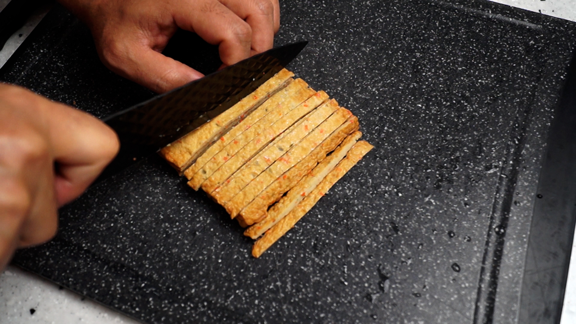 2. 어묵도 대략 0.5cm 로 두께감 있게 채를 썰어주세요.