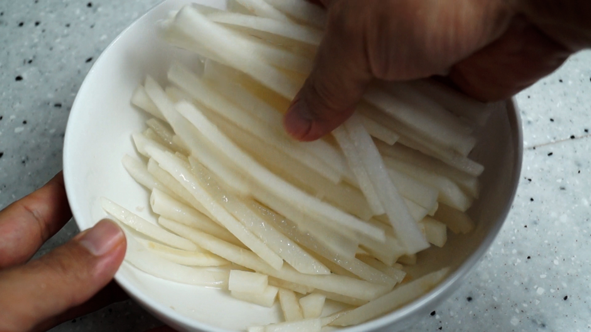 1. 무우를 0.5cm 정도 두께로 두께감이 있게 채썰어주세요.