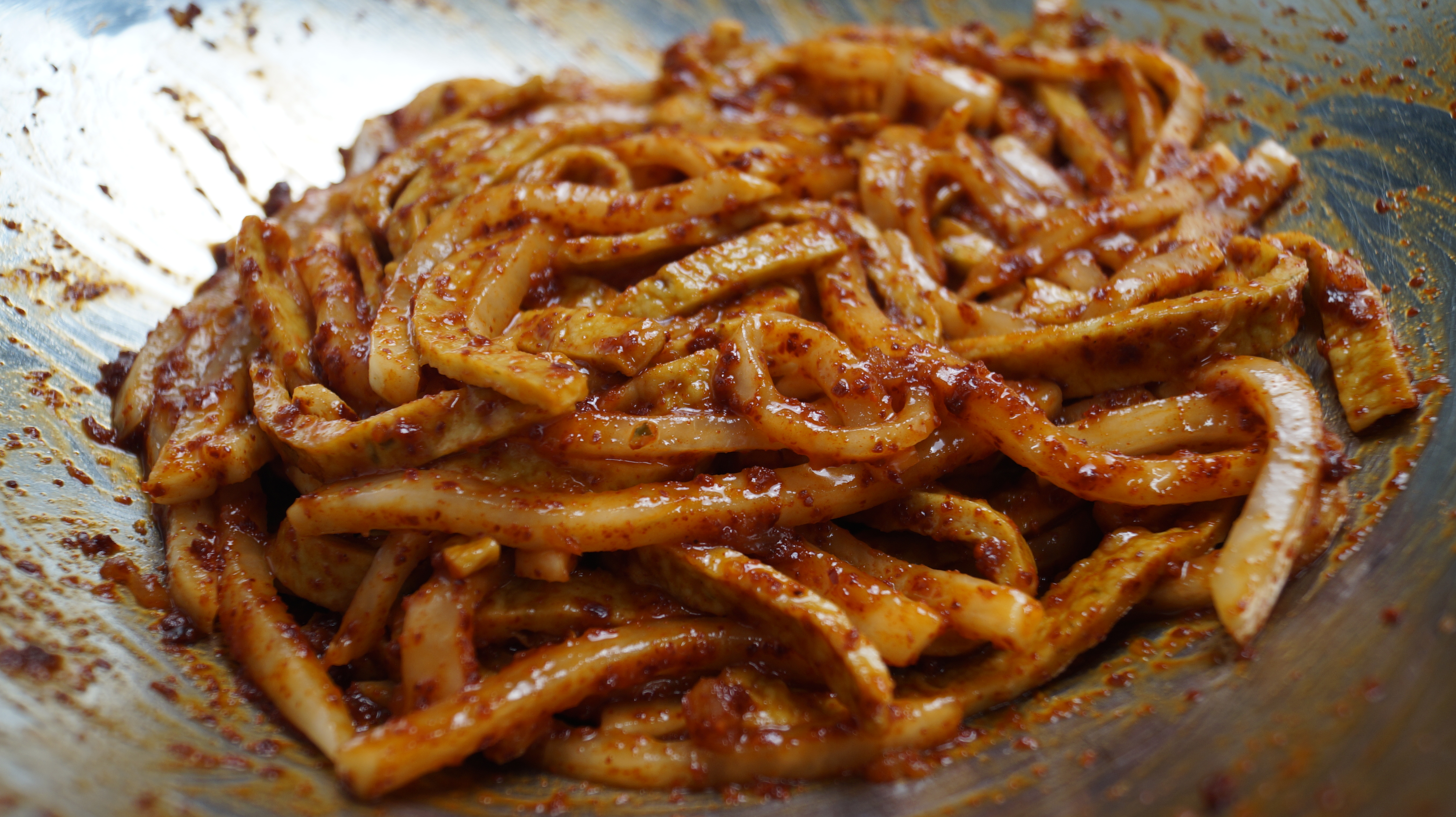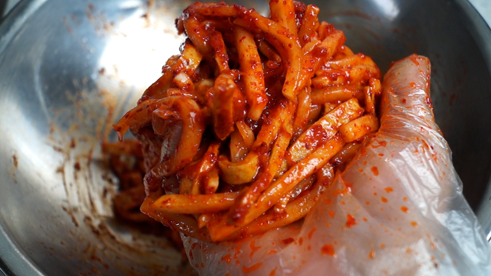 18. 양념에 어묵과 절인무우를 넣고 버무려주세요.