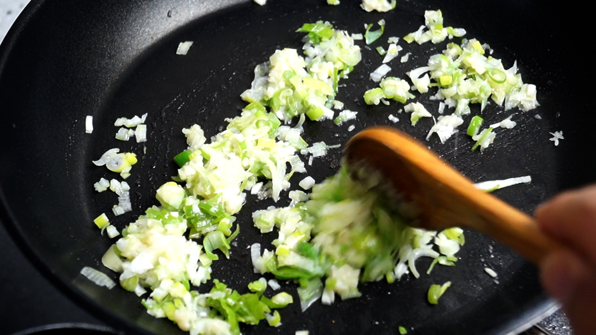 8. 썰어놓은 대파를 넣고 약불 유지하고 1분 30초 정도를 더 볶아주세요.