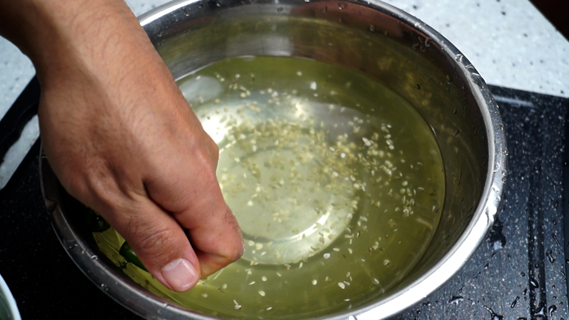 4. 씨를 빼고 싶을땐 일일히 빼지 마시고 찬물에 담궈 휘휘 저어주세요.