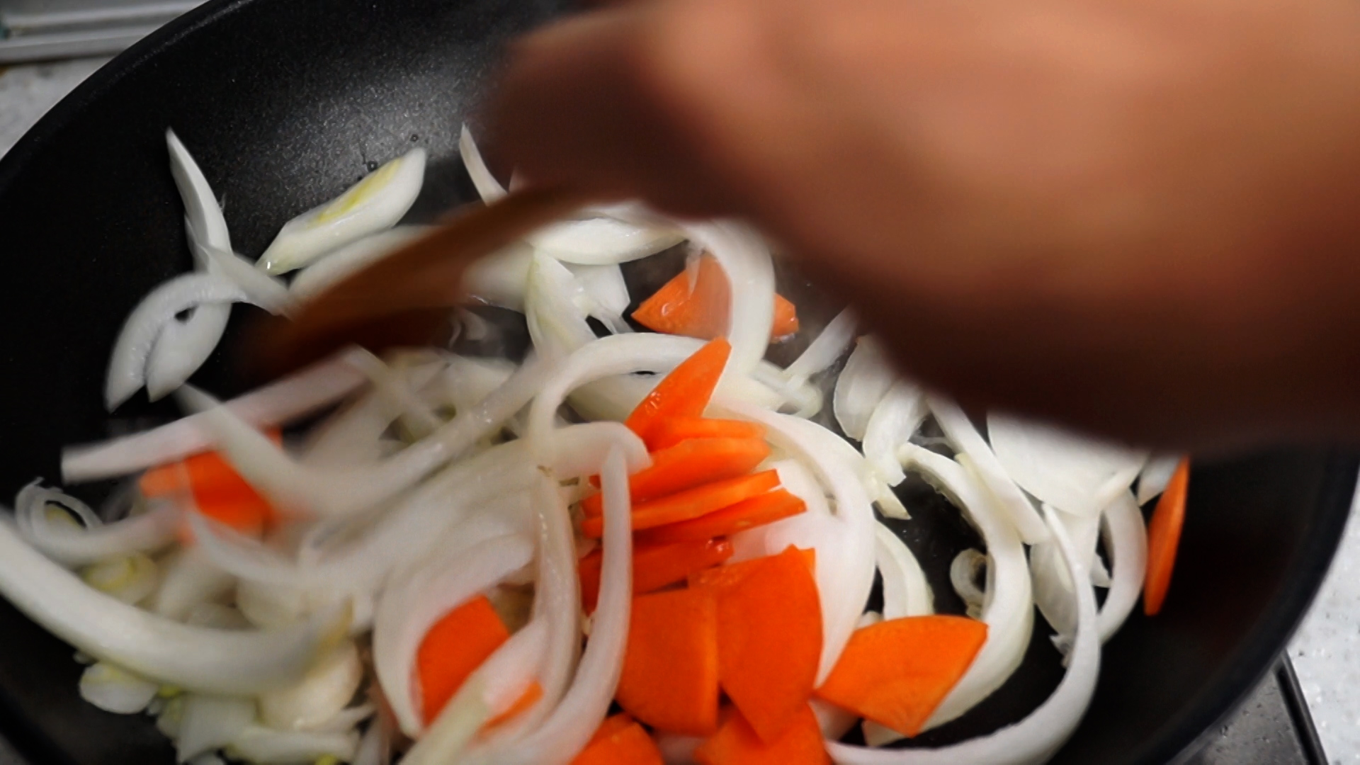 17. 팬에 식용유를 붓고 중불로 달궈서 양파 당근을 넣고 2분 정도를 볶아주세요.