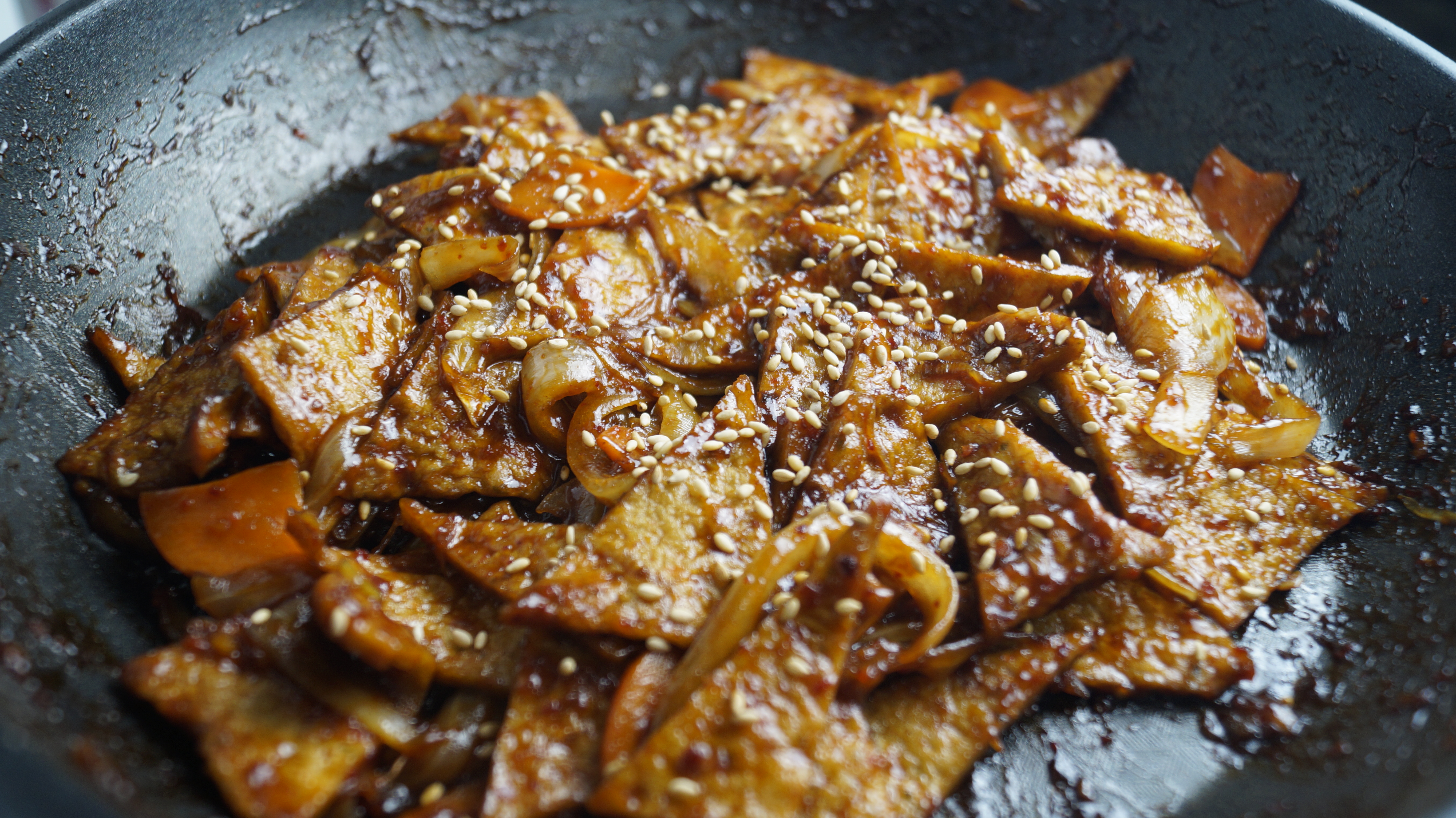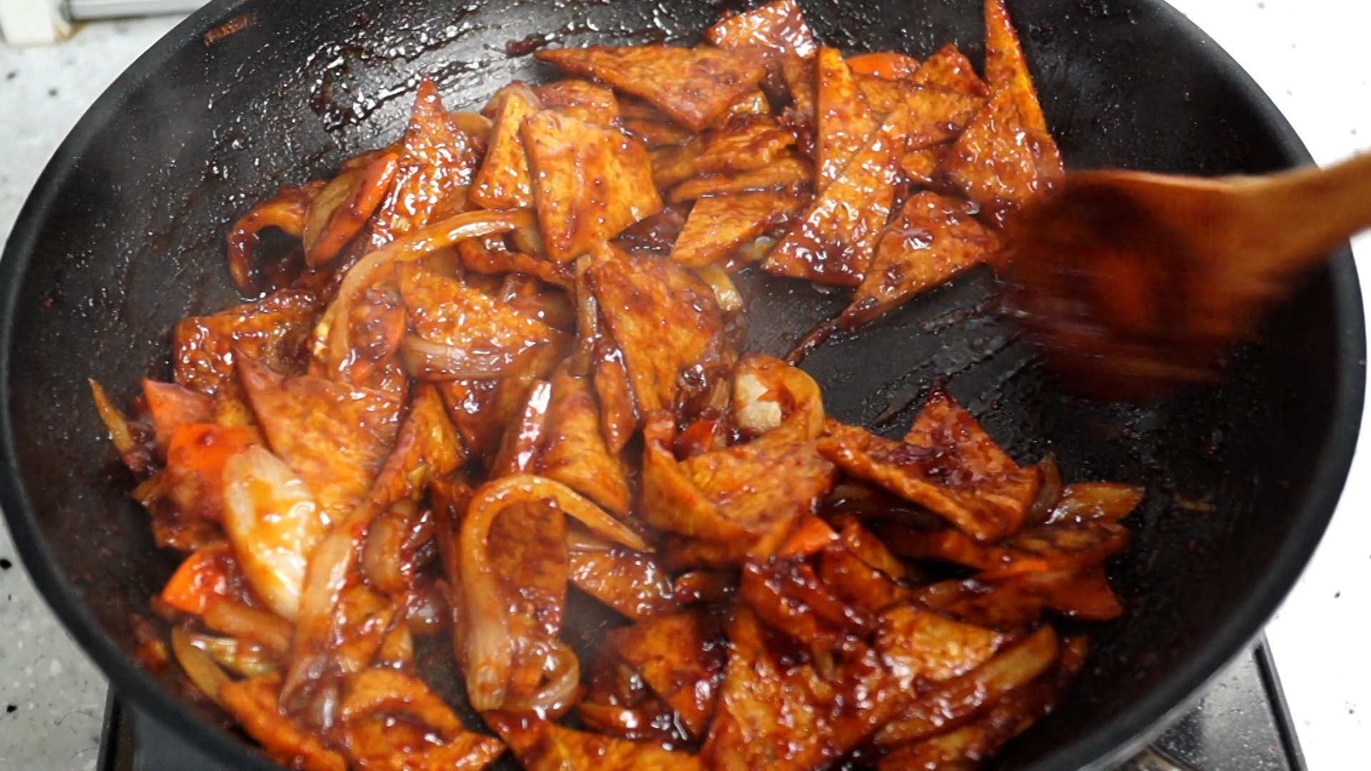 19. 양념을 80% 정도만 붓고 불을 약불로 줄이고 30초 정도를 볶아주세요.