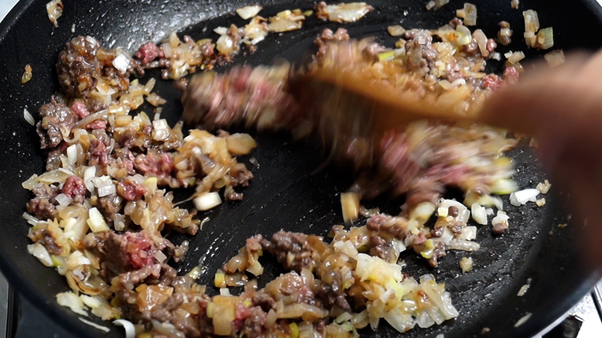 5. 대파와 소고기 다짐육을 넣어주세요. 소고기는 키친타월로 꾹꾹 눌러 핏기를 한번 빼주시면 좀더 깔끔한 맛을 낼수 있습니다.