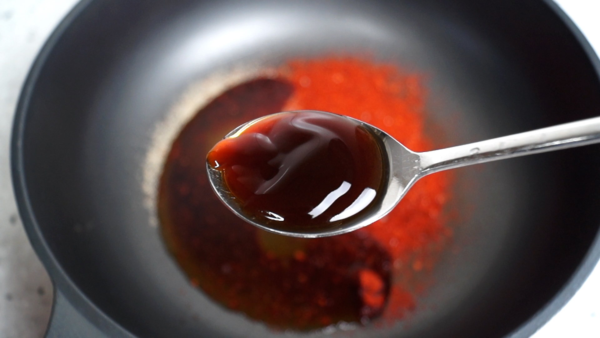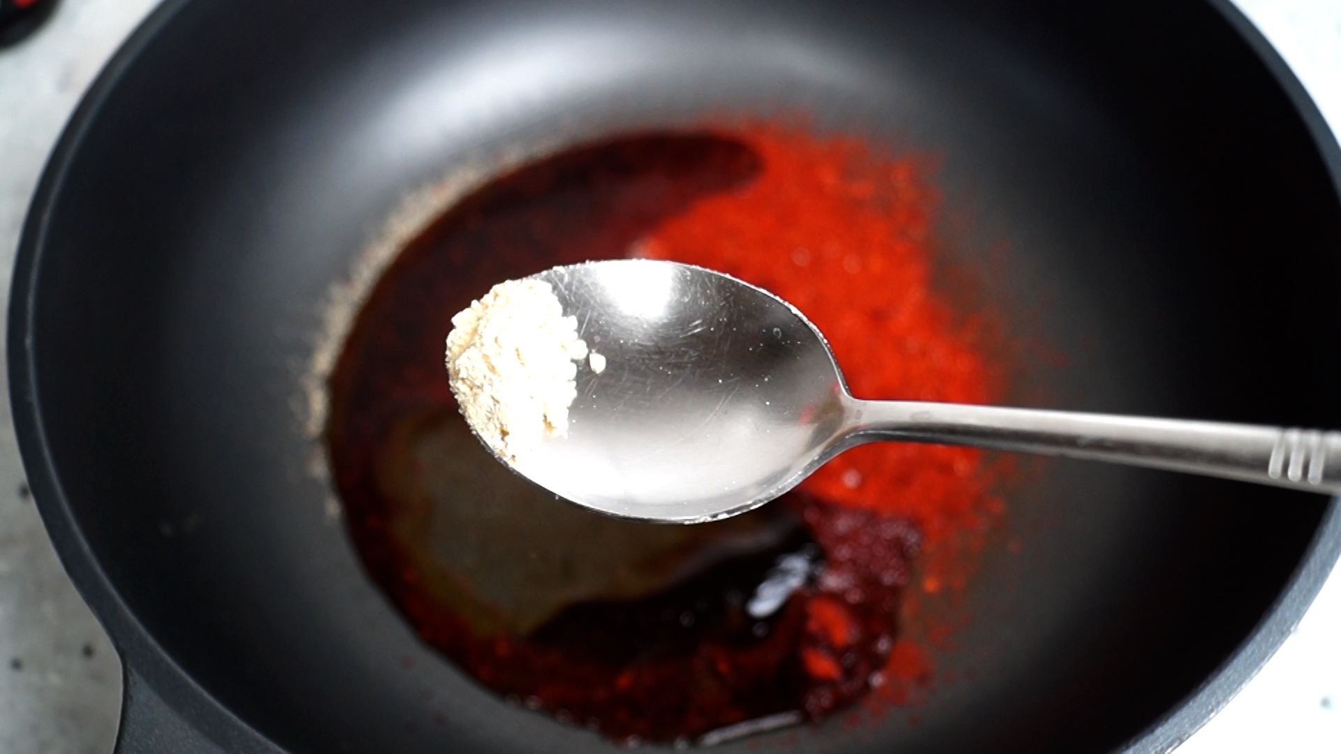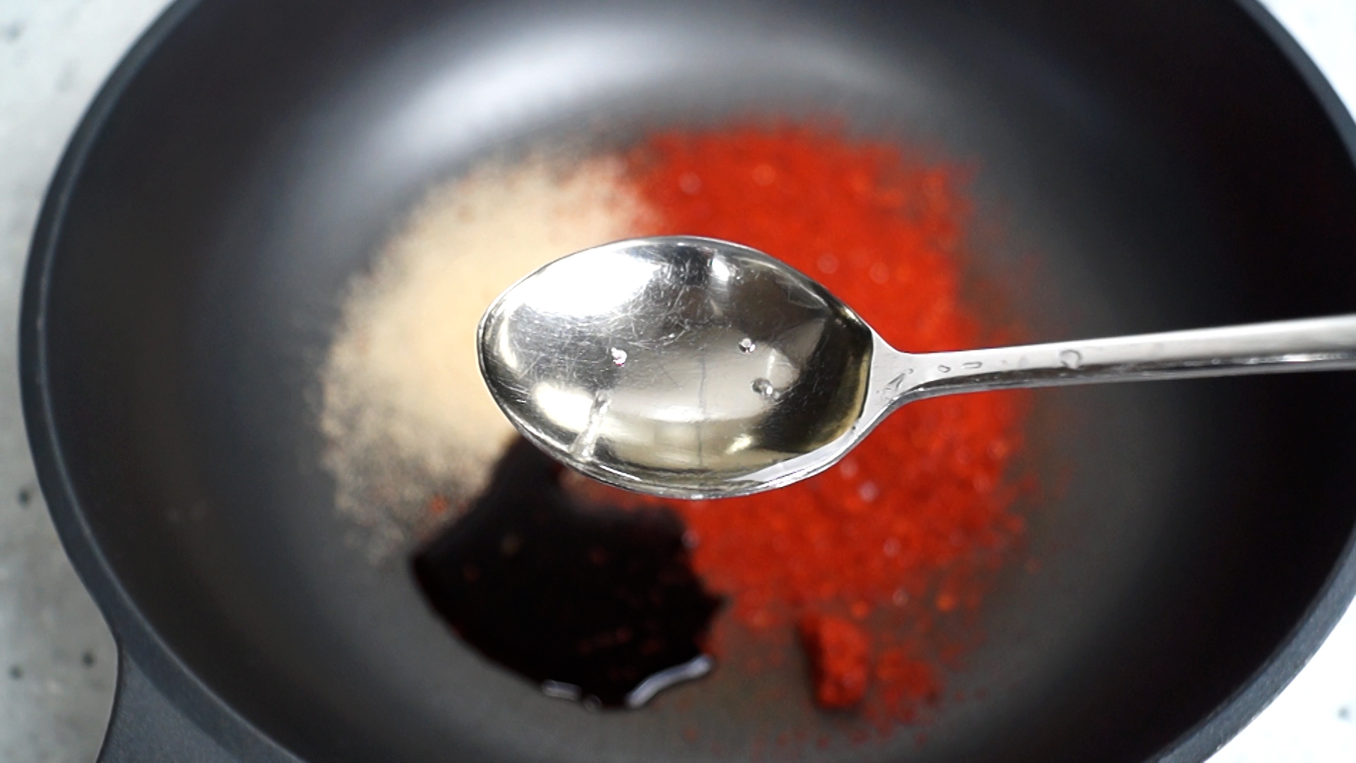 3. 양념란에 적힌 재료를 전부 웍이나 팬에 부어주세요. 고춧가루는 중간입자 고춧가루입니다.