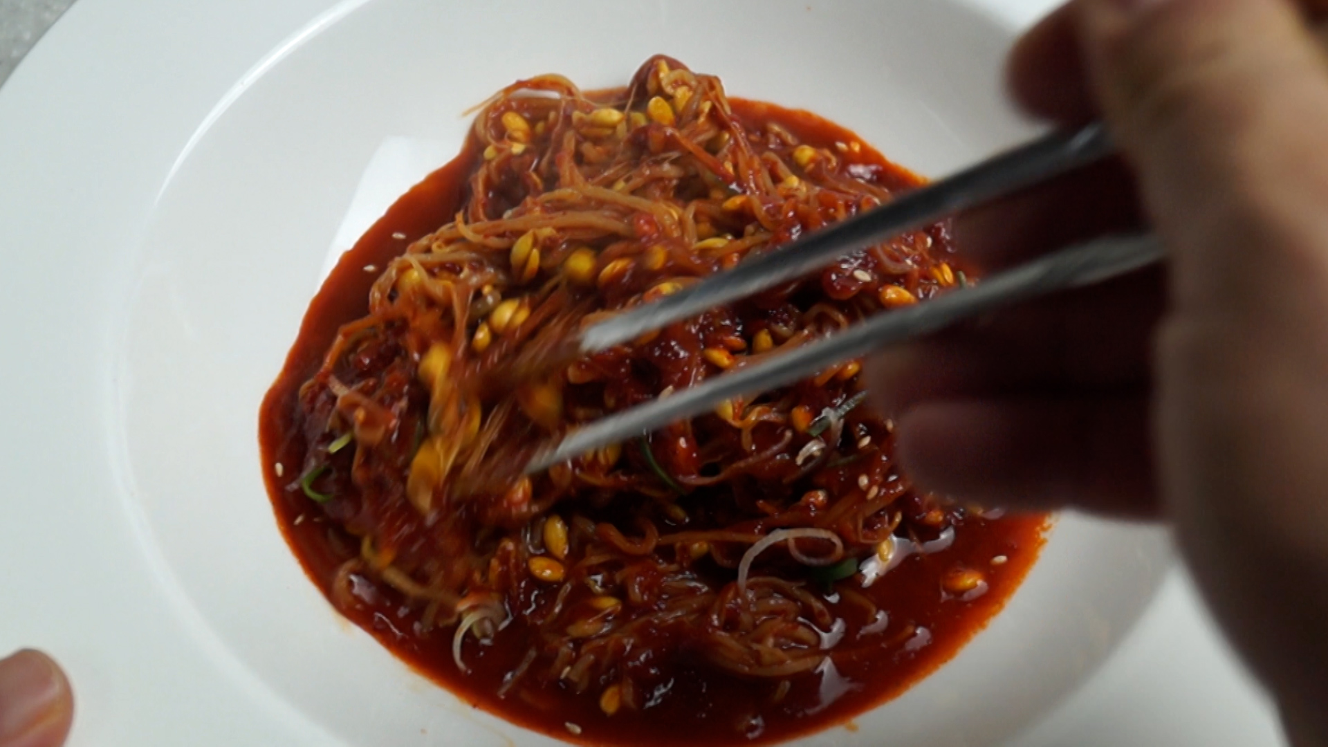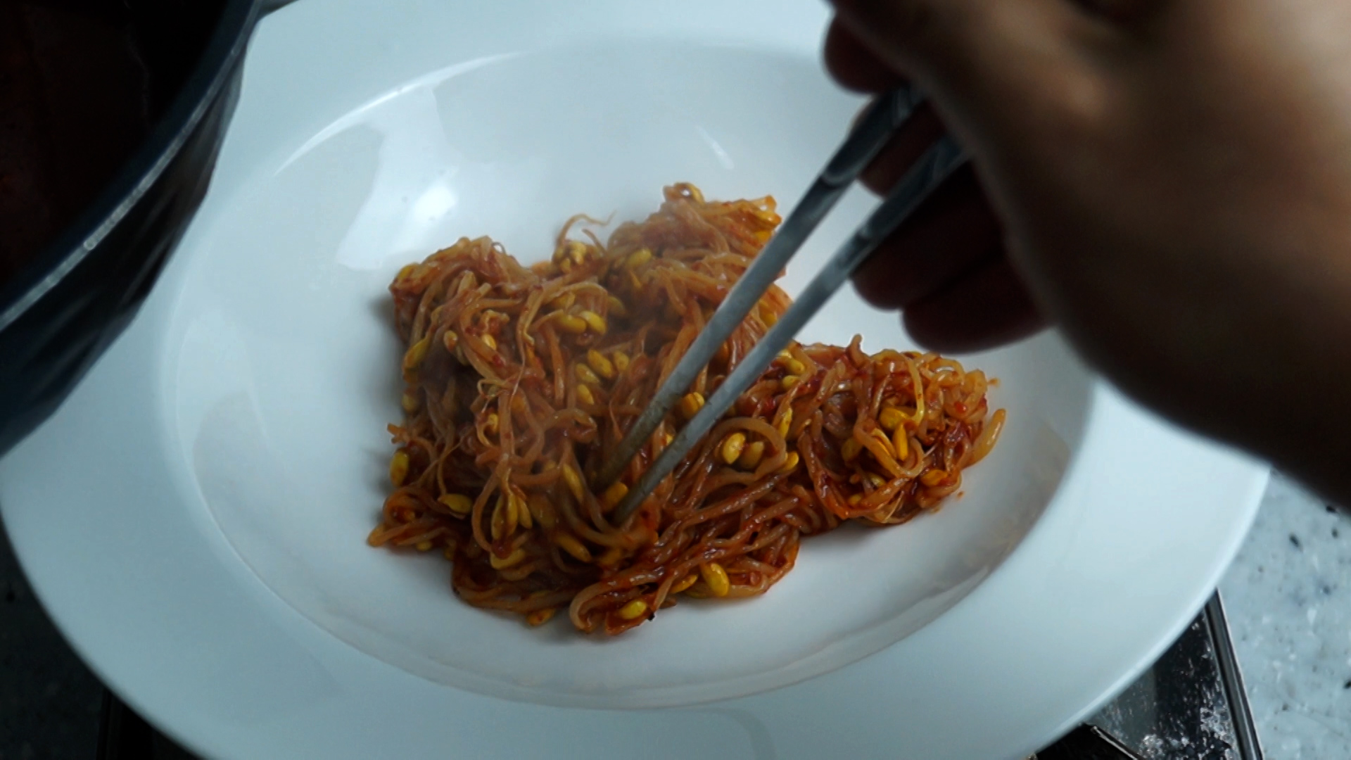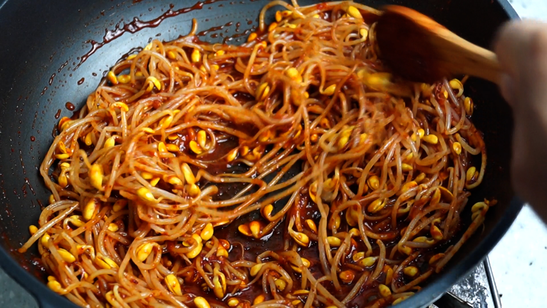 20. 진득하게 졸여진 양념을 콩나물 위에 뿌려주세요.