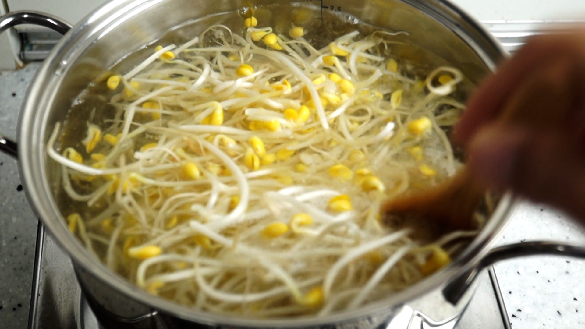 1. 물 2리터를 끓여서 콩나물을 오래 삶을 필요 없이 1분만 삶아주세요.