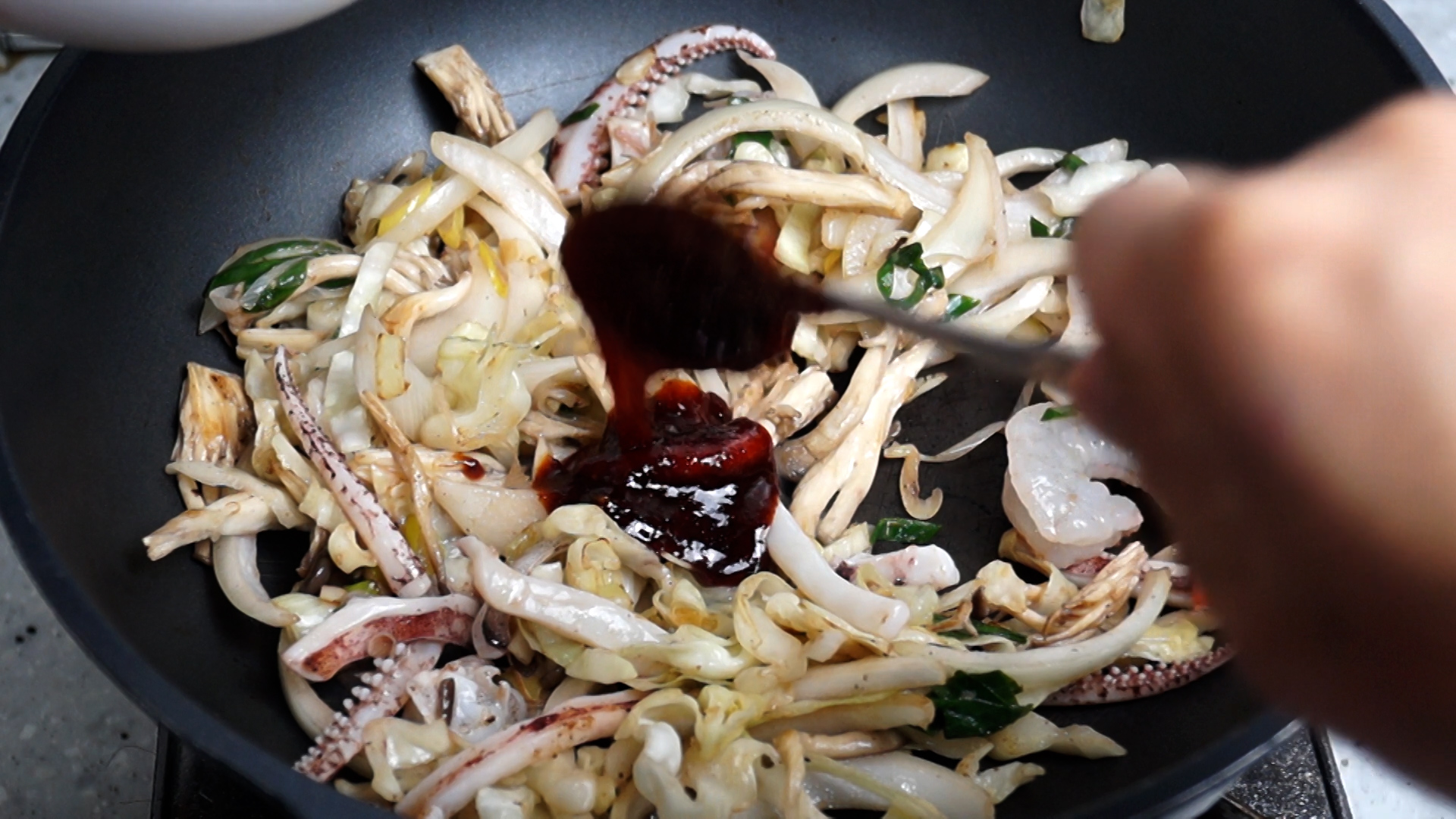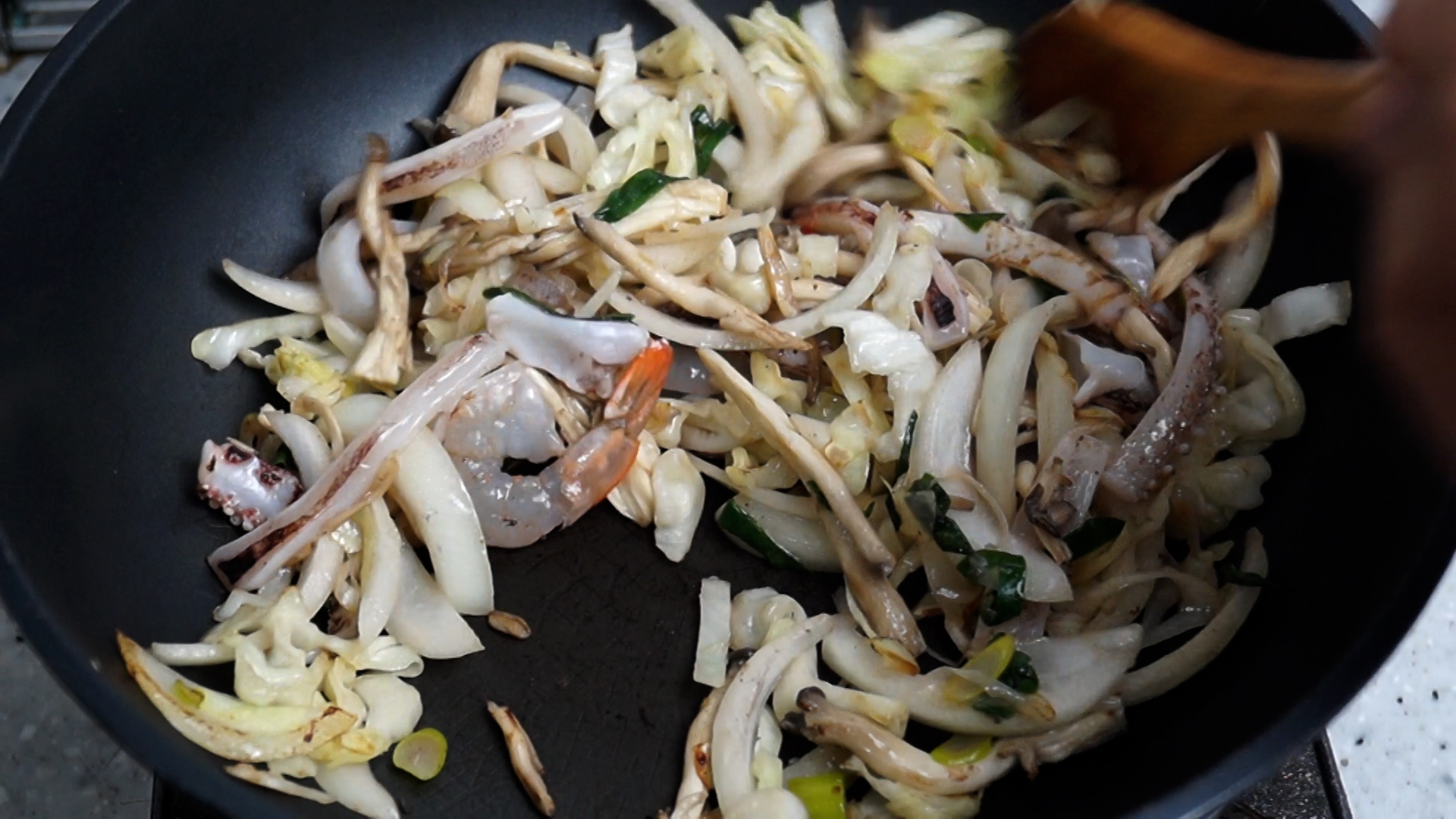 22. 해물을 넣고 30~40초를 더 볶아주세요.