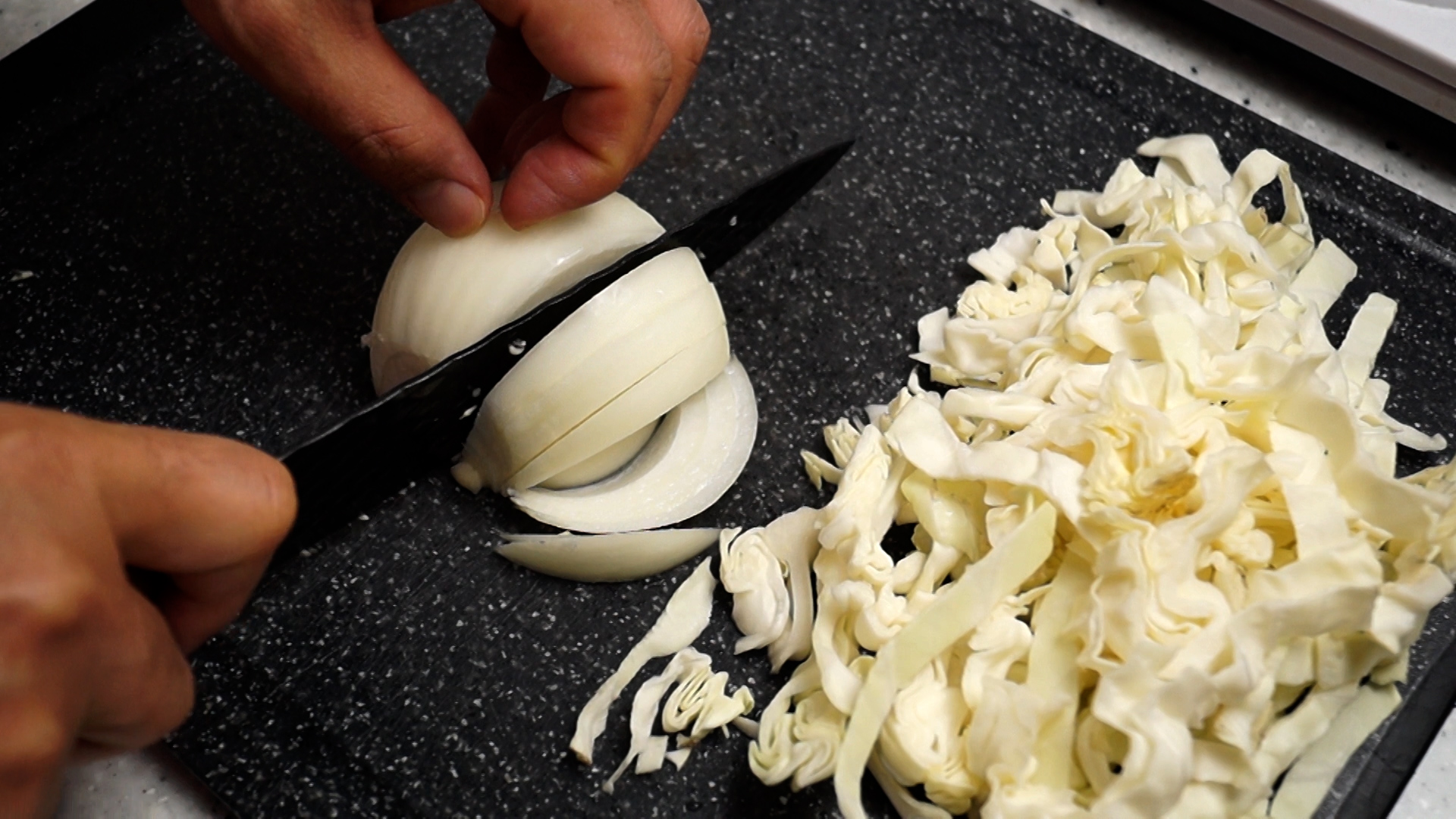 1. 양배추는 1cm 정도로 썰어주세요. 저울이 없어 무게가 애매하시면 500cc 국그릇에 한가듯 쌓을 정도로 준비하시면 됩니다.