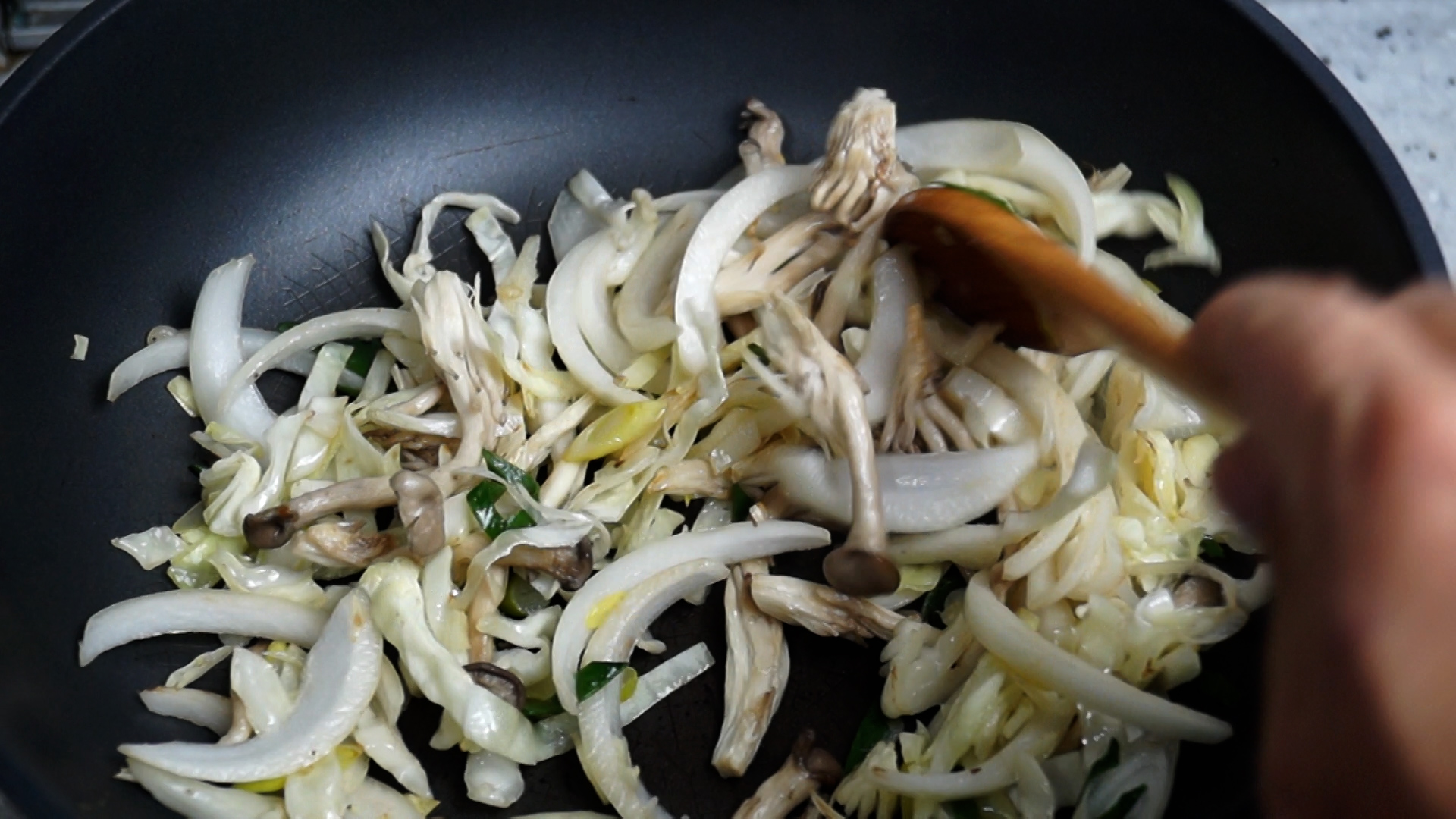 21. 우동사리 삶는 동안 식용유를 분량껏 넣고 강불로 달궈 야채를 넣고 1분간 볶아주세요.