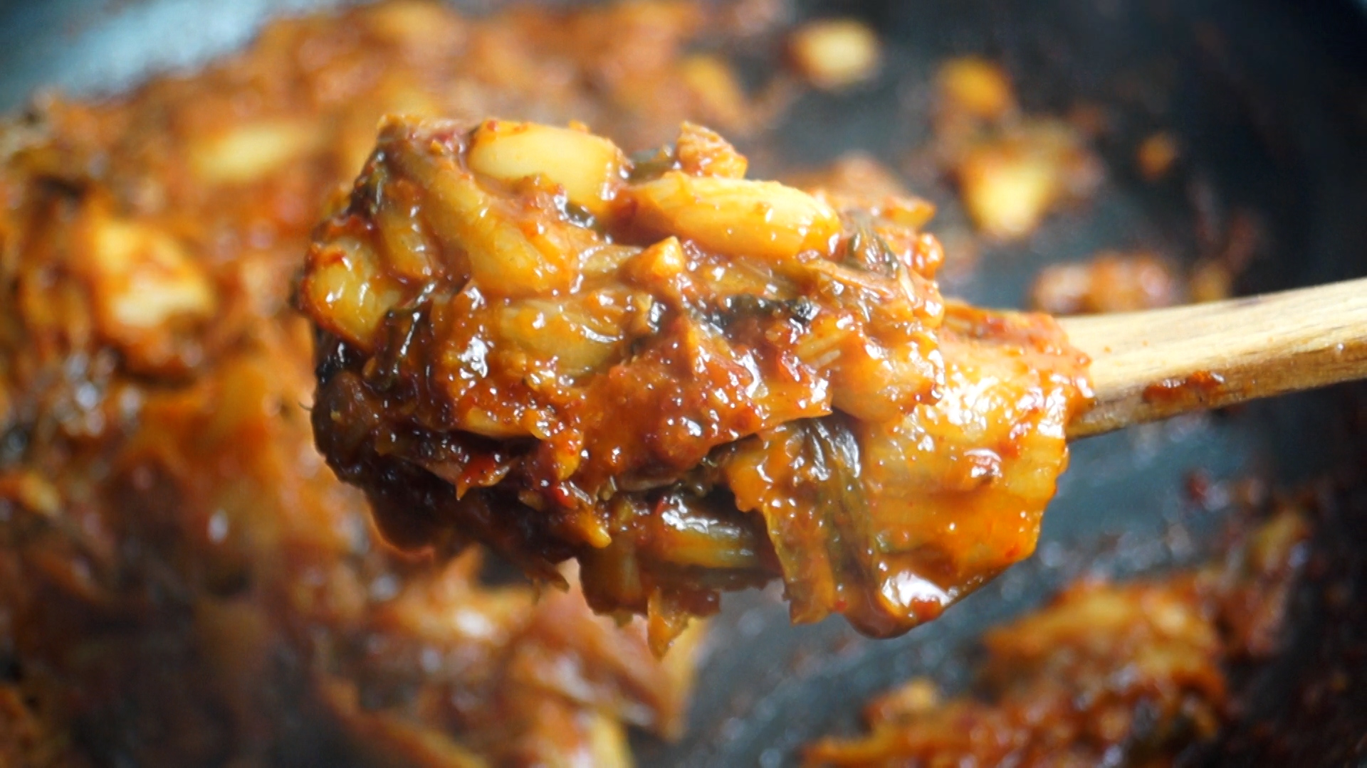 15. 물을 붓고 강불에 또 꾸덕해 질때까지 볶아주세요. 물을 넣고 한번더 졸이면 양념과 재료맛이 더 맛있게 우러나서 진한 볶음김치를 즐기실수 있습니다.