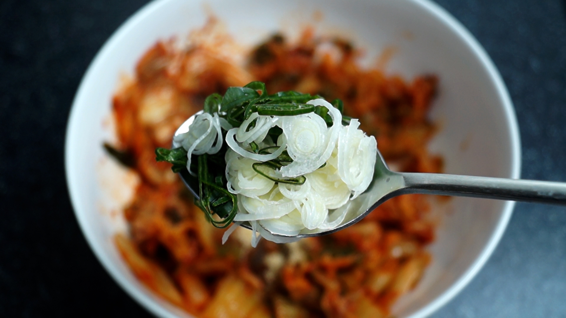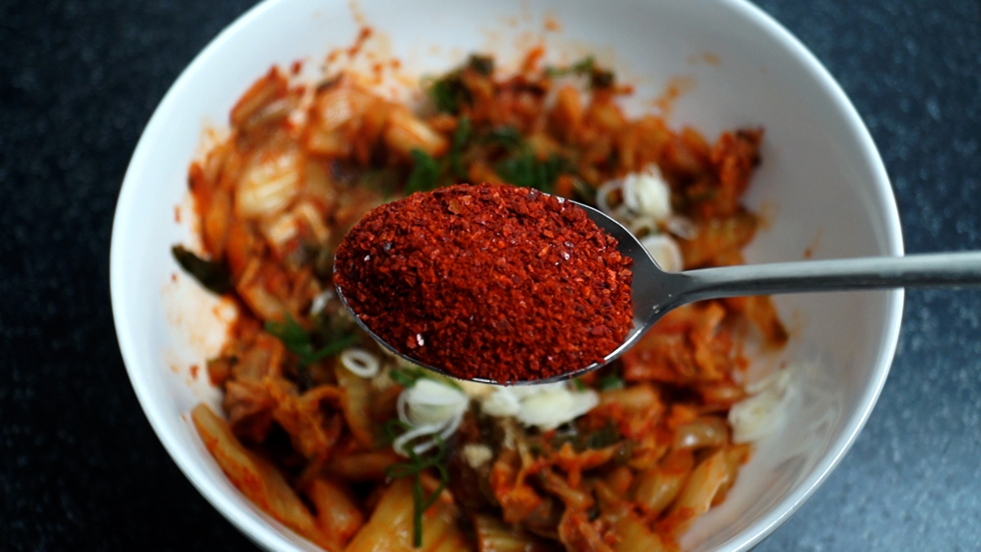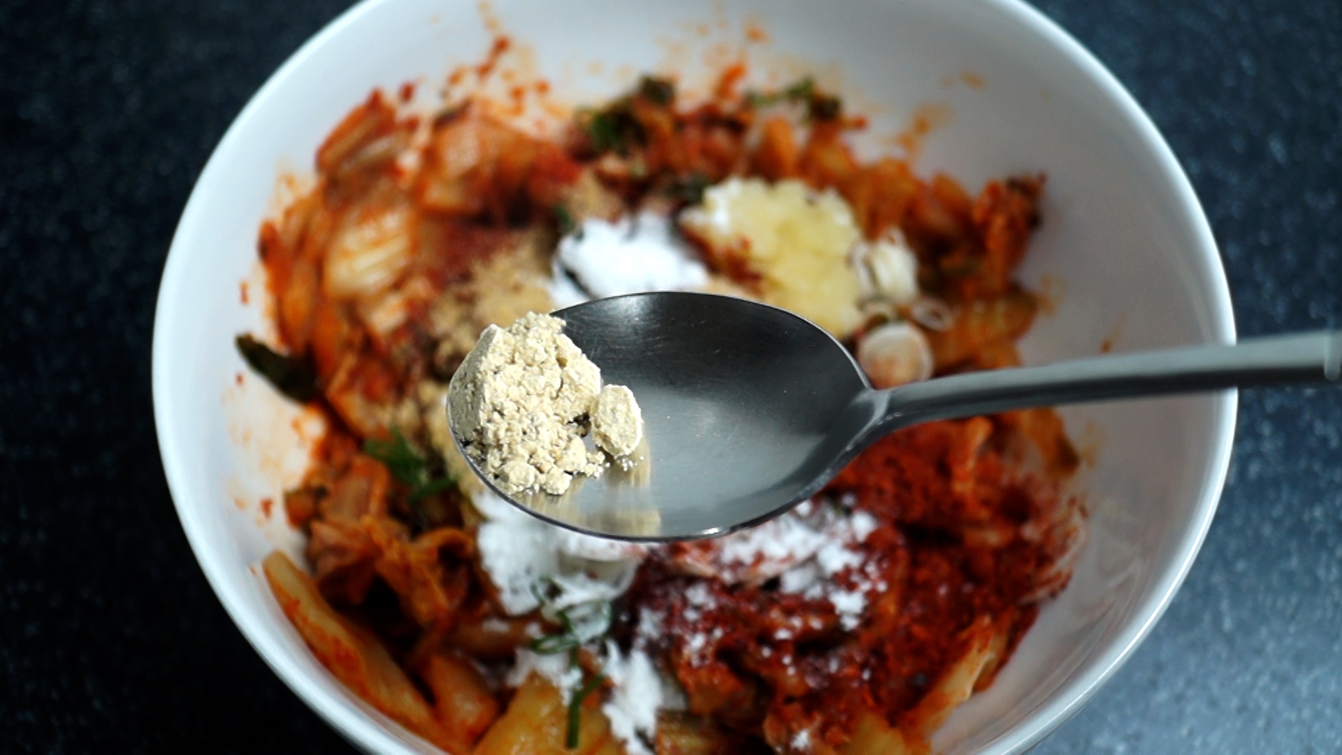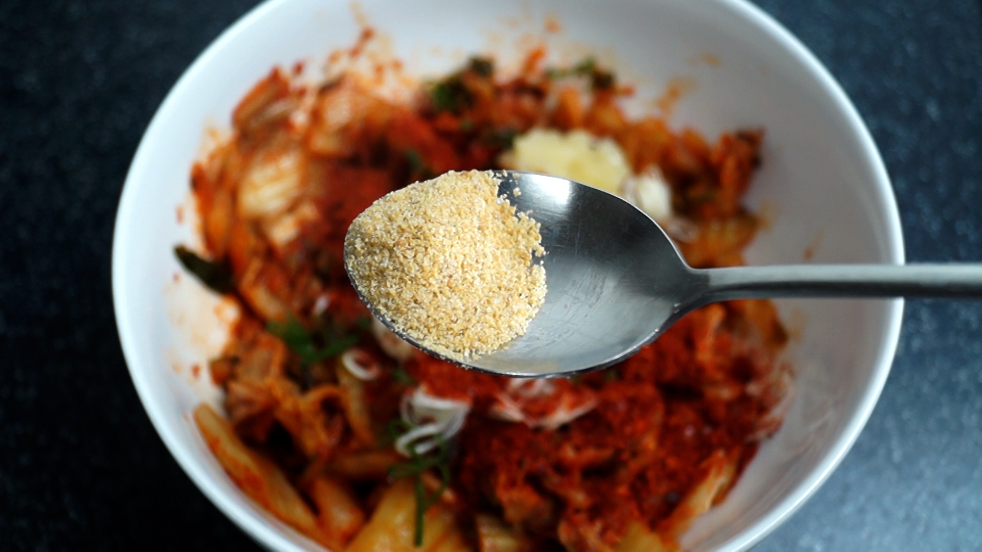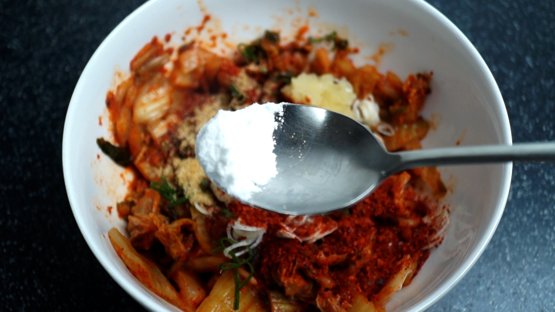 7. 찹쌀가루를 넣어보세요. 점도를 살짝 더해서 김치볶음 양념이 입에 촥촥 감기게 만들어 줍니다.
