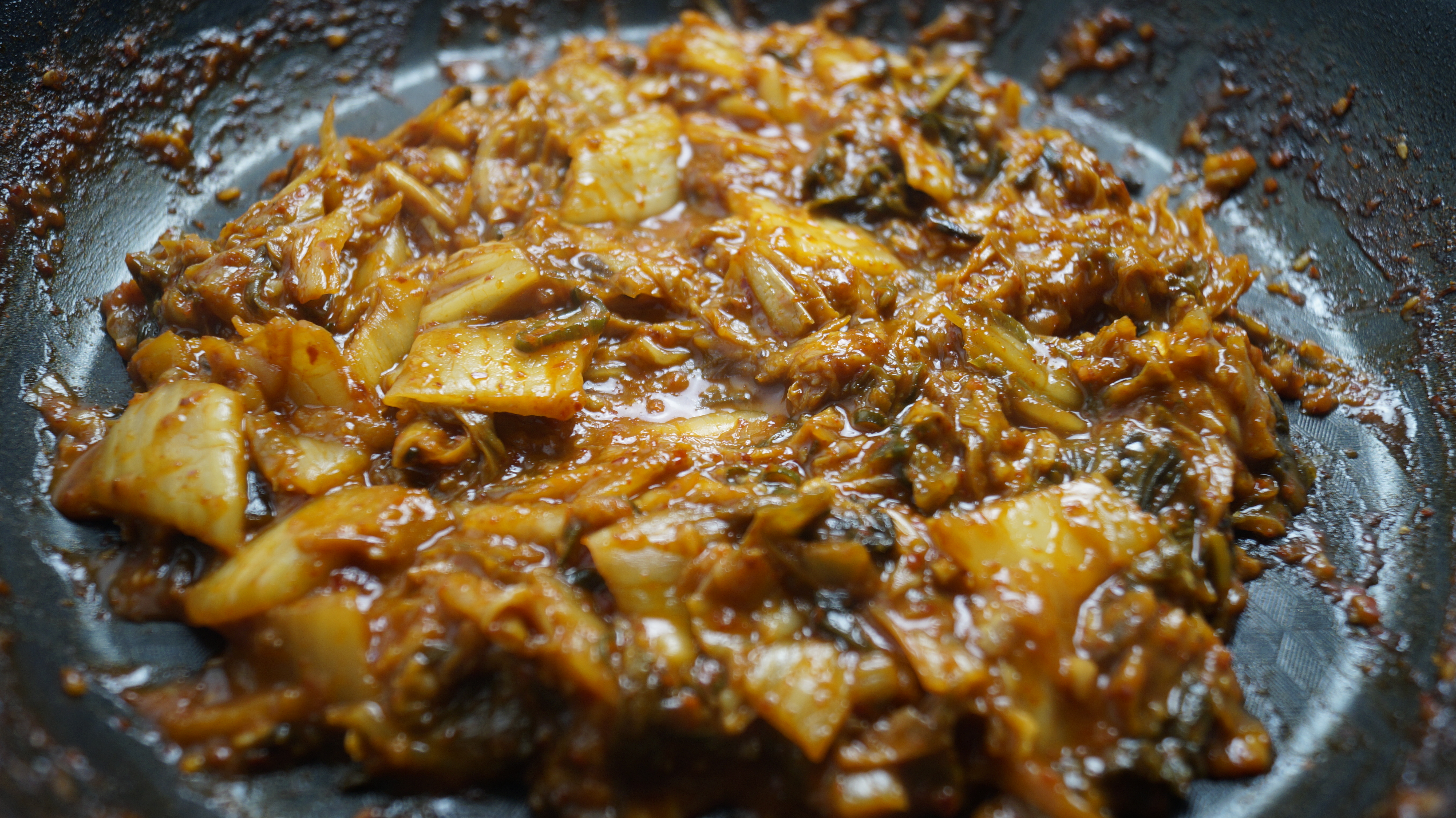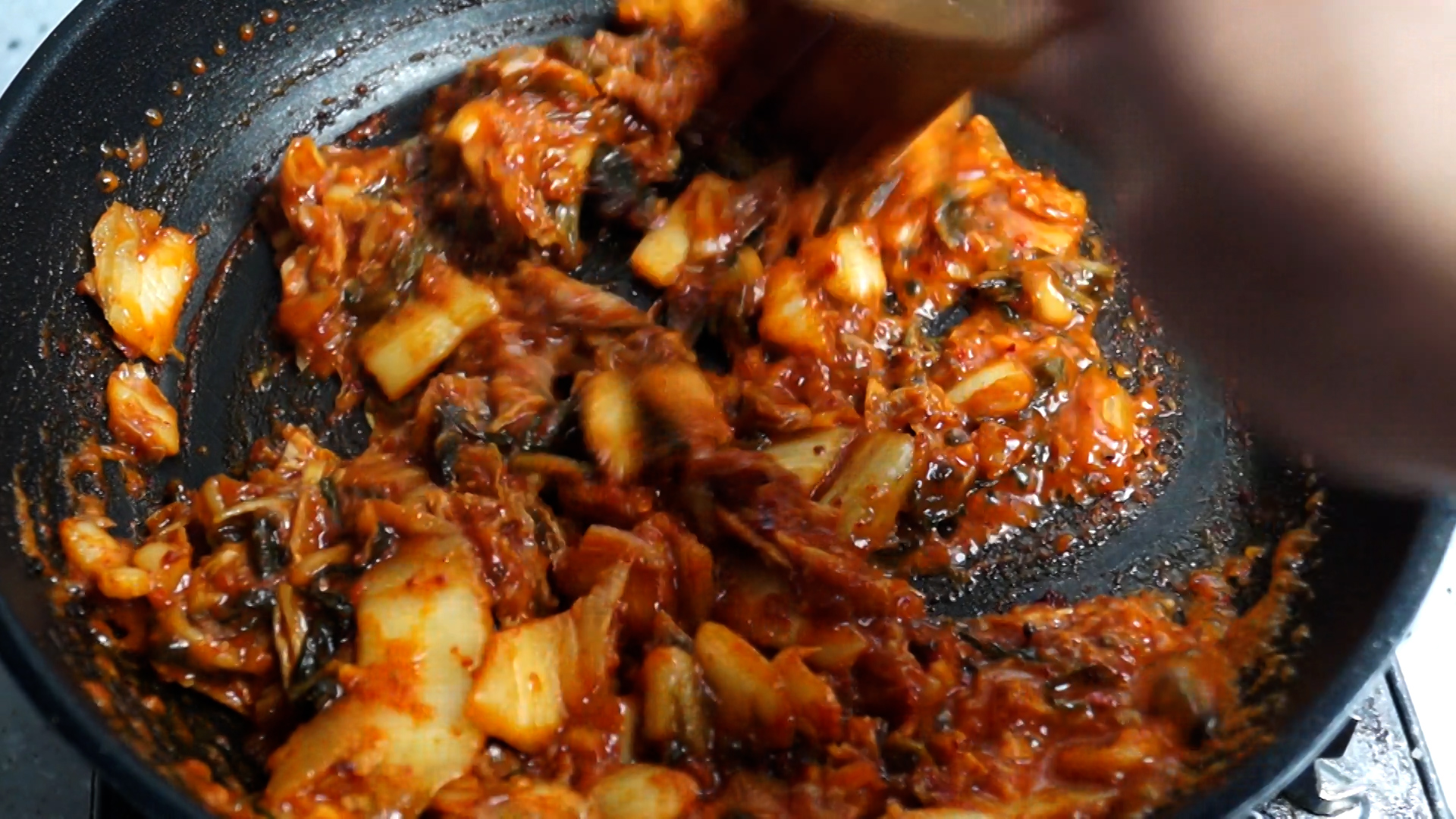 13. 김치를 넣은 다음 강불로 불 올리고 2분 정도 볶아주세요.