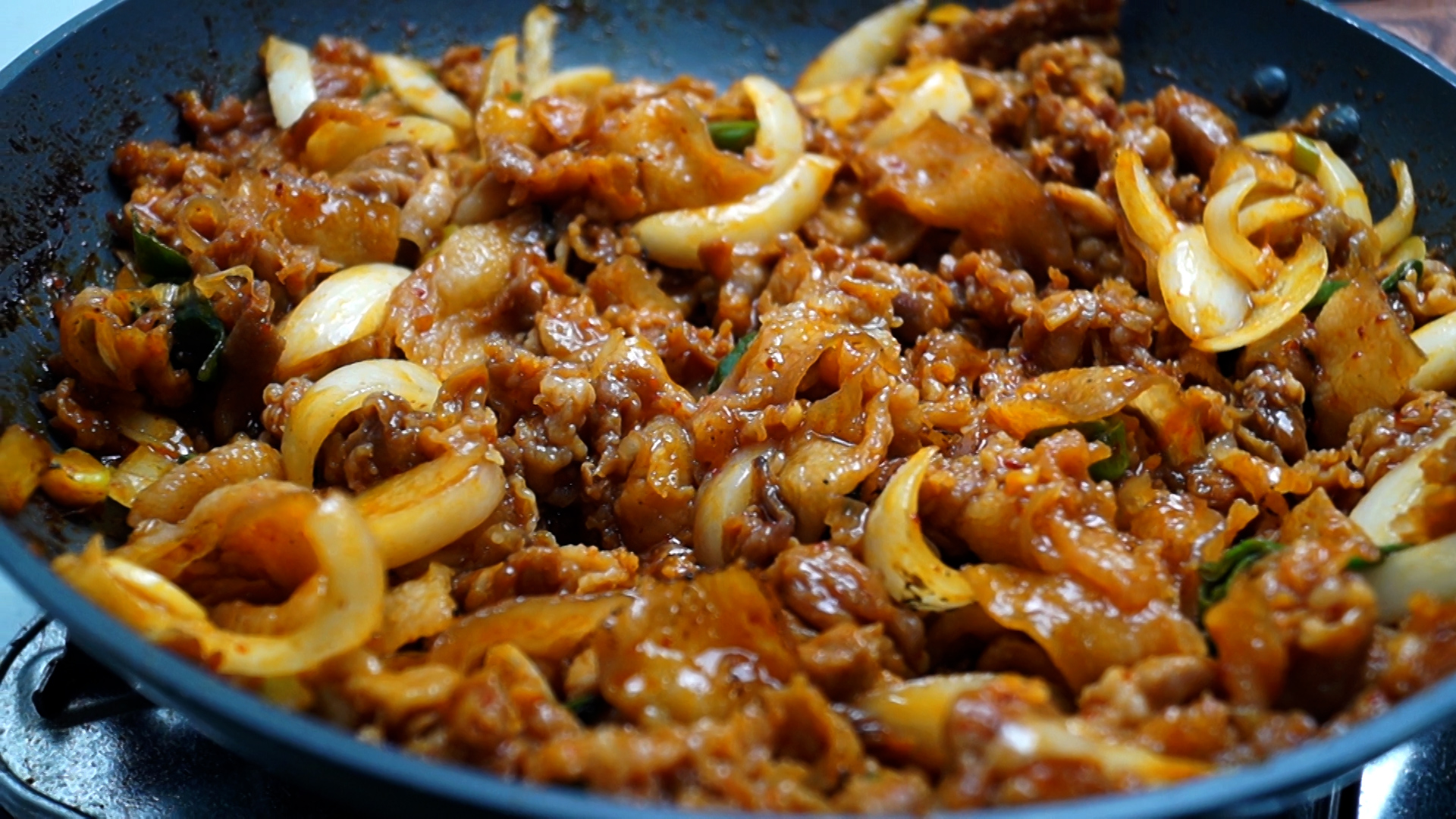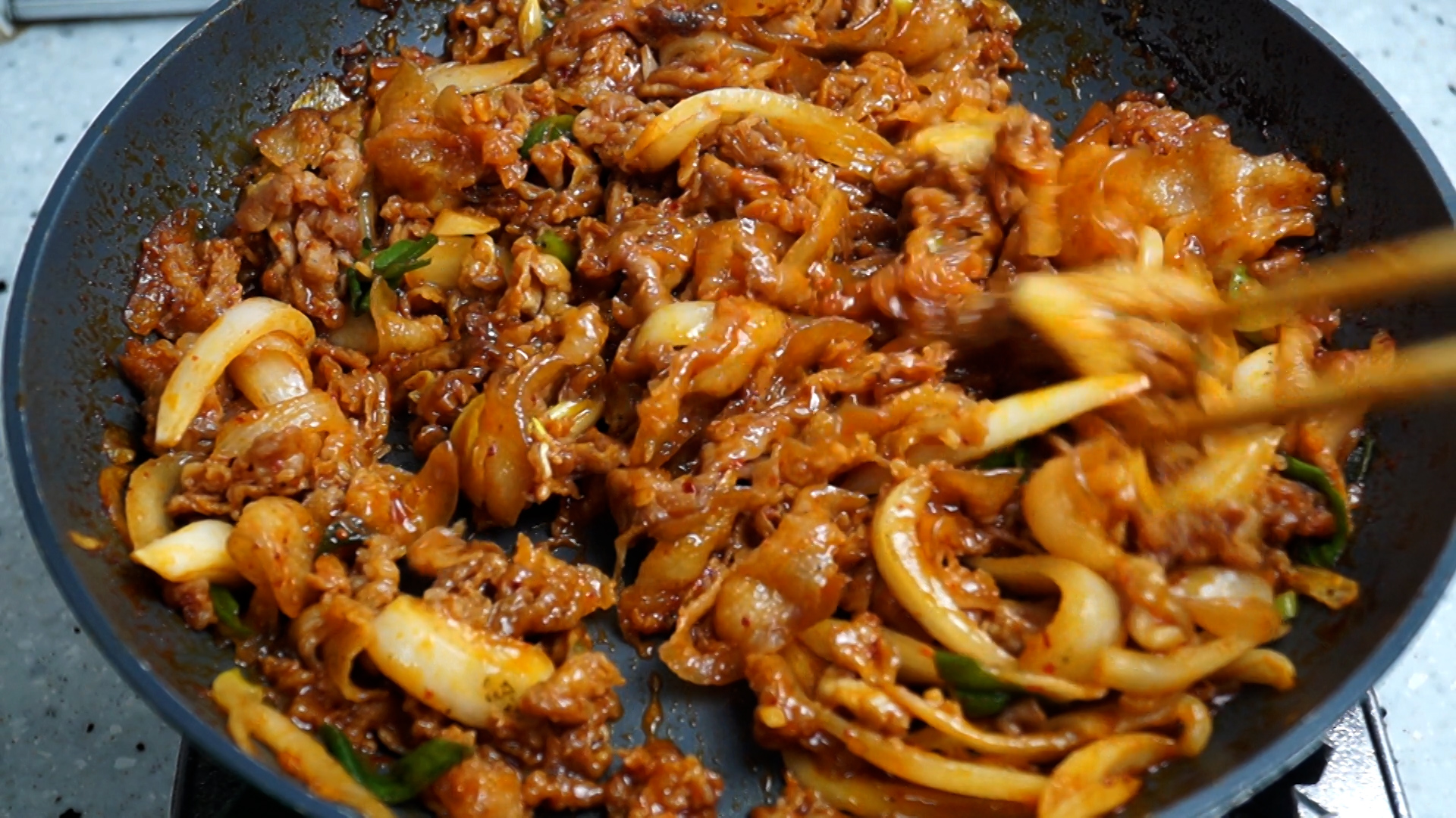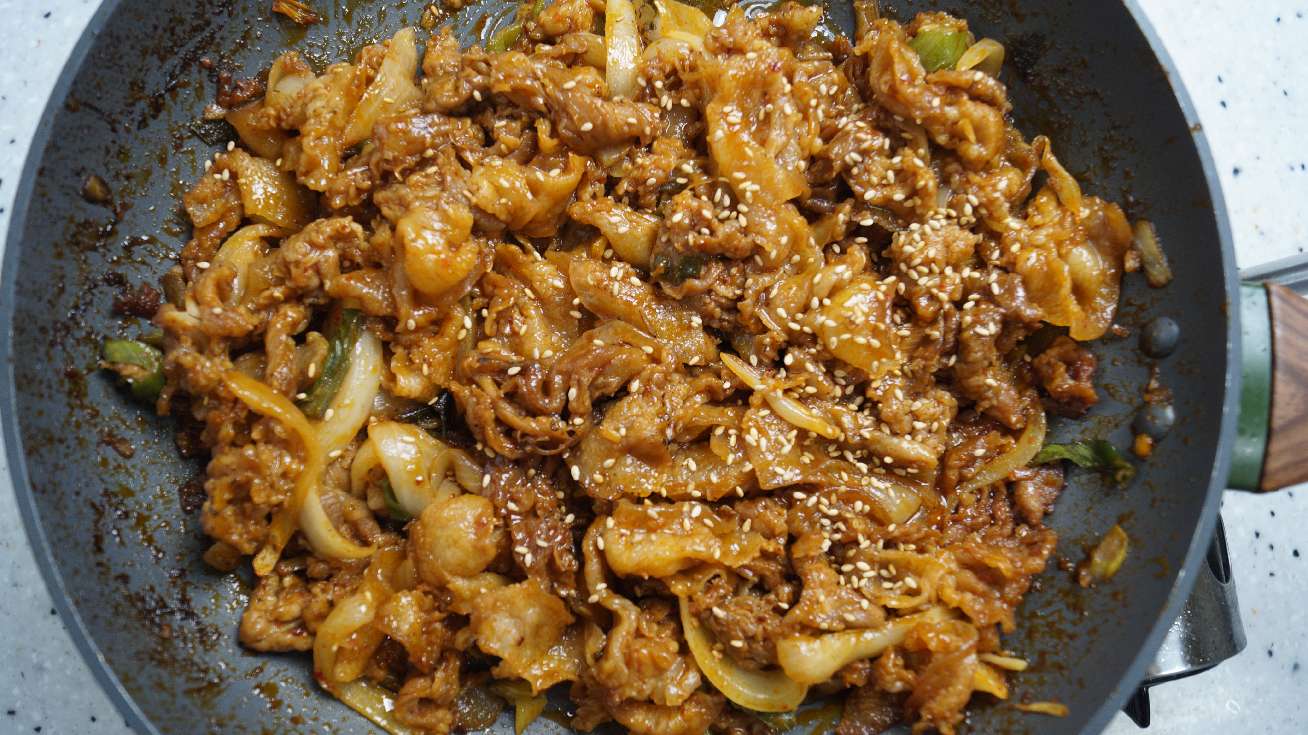 20. 고기 굽기 직전에 야채를 고기에 넣고 골고루 버무린 다음 팬을 강불로 달궈서 고기를 구워 주세요. 야채 수분도 나오고 고기가 얇아서 고기가 익기전에 타지 않으니 꼭 강불로 시작해서 강불로 끝내주세요! 그래야 더 맛있습니다.