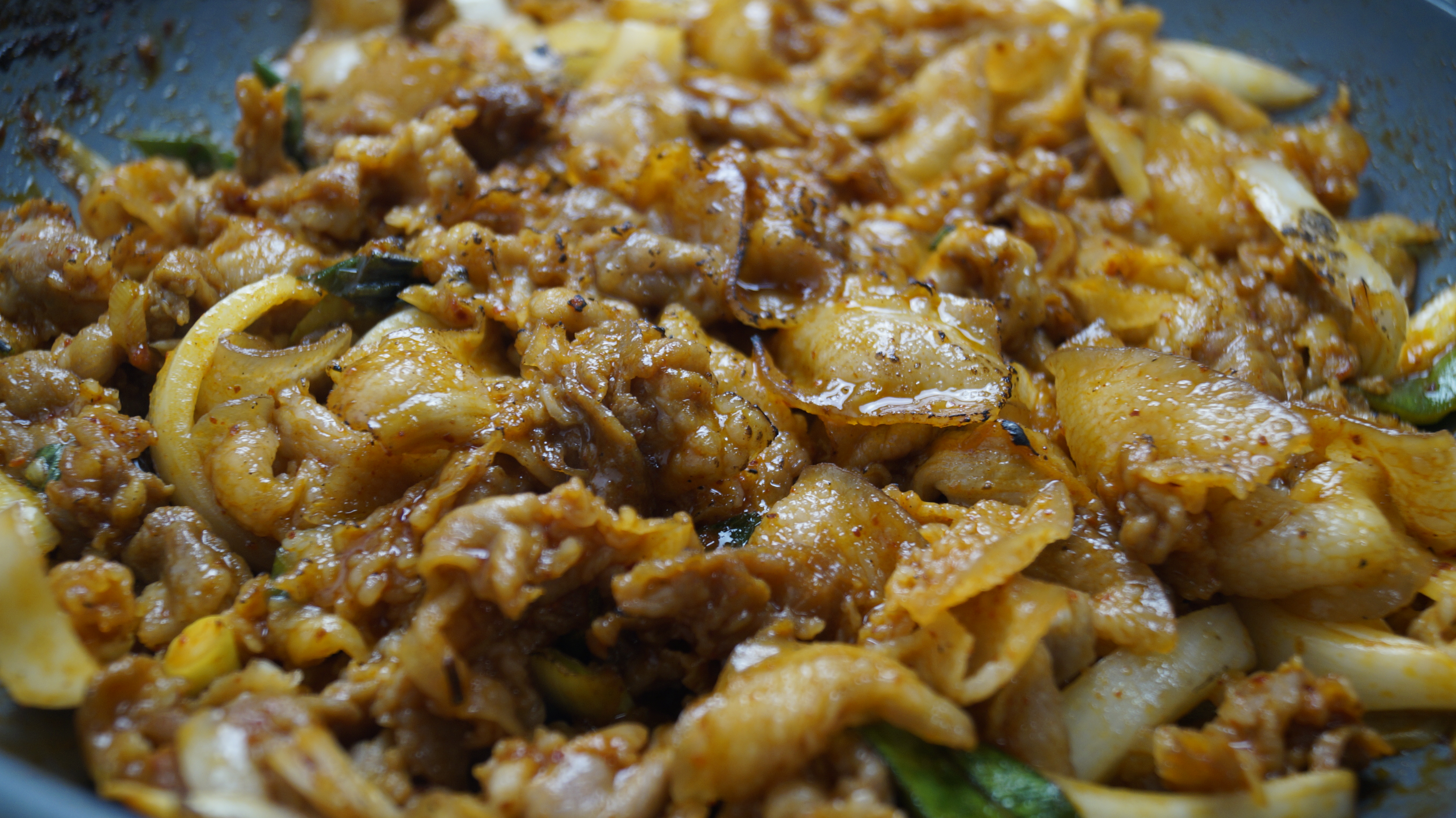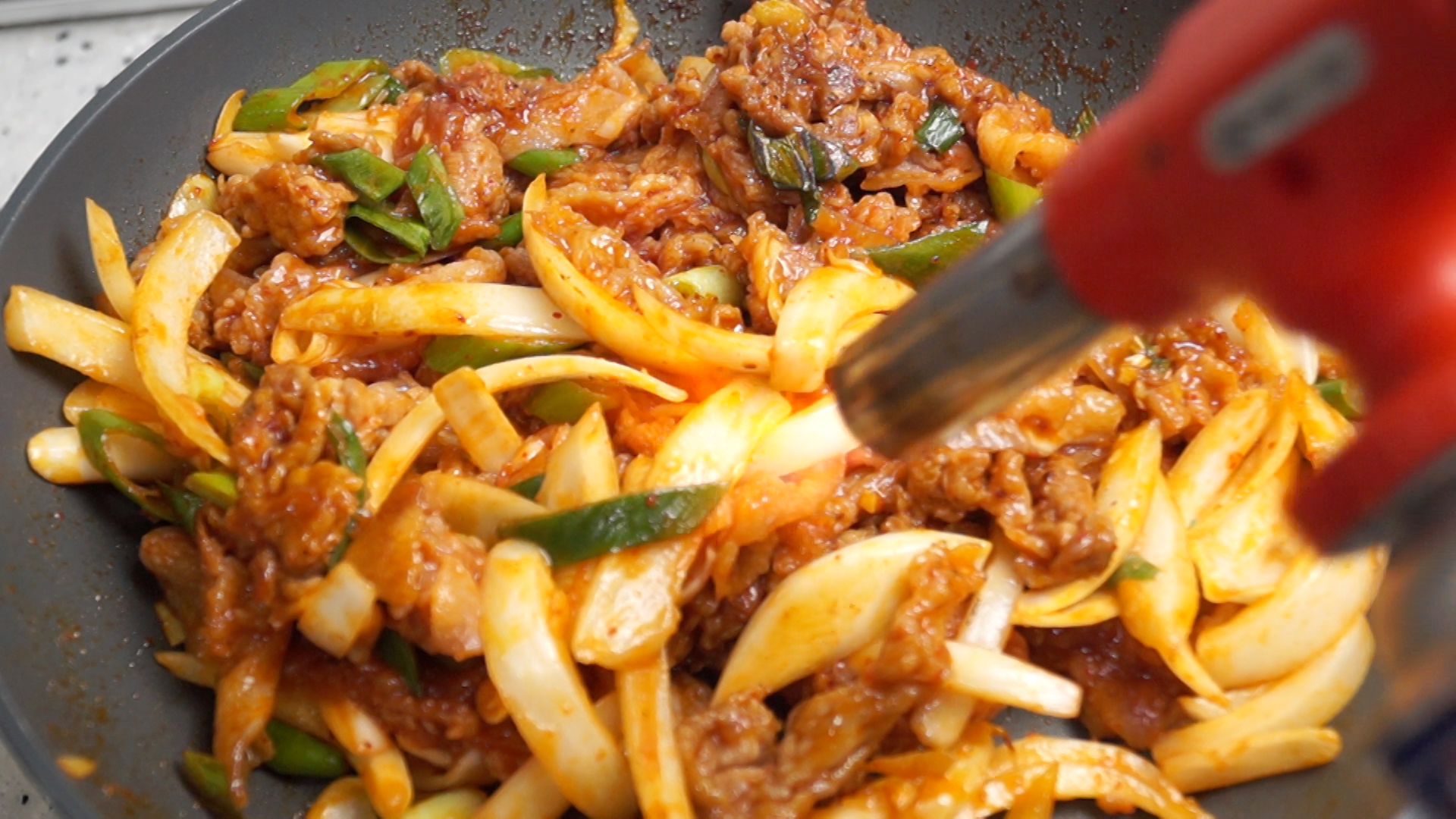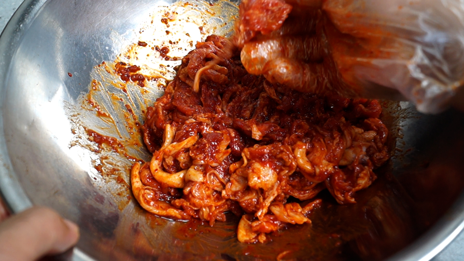 20. 고기 굽기 직전에 야채를 고기에 넣고 골고루 버무린 다음 팬을 강불로 달궈서 고기를 구워 주세요. 야채 수분도 나오고 고기가 얇아서 고기가 익기전에 타지 않으니 꼭 강불로 시작해서 강불로 끝내주세요! 그래야 더 맛있습니다.