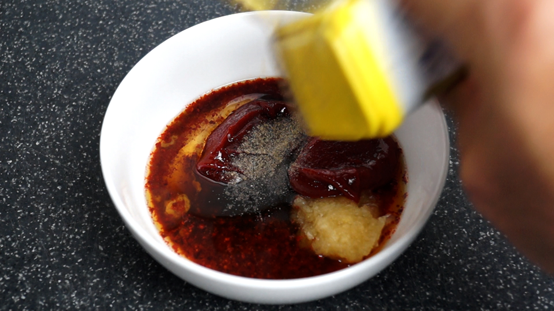 4. 양념란에 적힌 재료를 한데 넣어주세요. 고춧가루는 중간입자 고춧가루입니다.