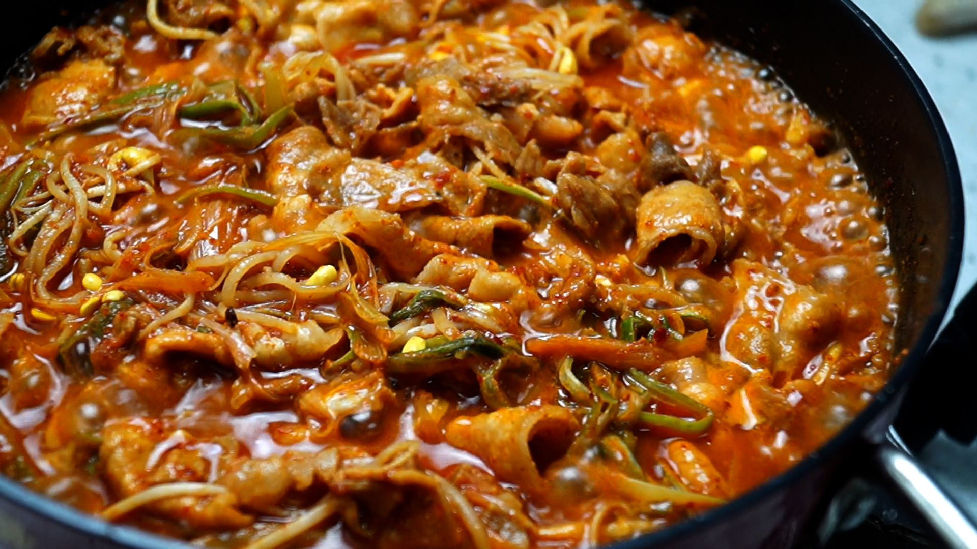 15. 야채 수분으로 국물이 바글바글 끓으면 강불 유지하고 3~4분 더 볶아주세요.